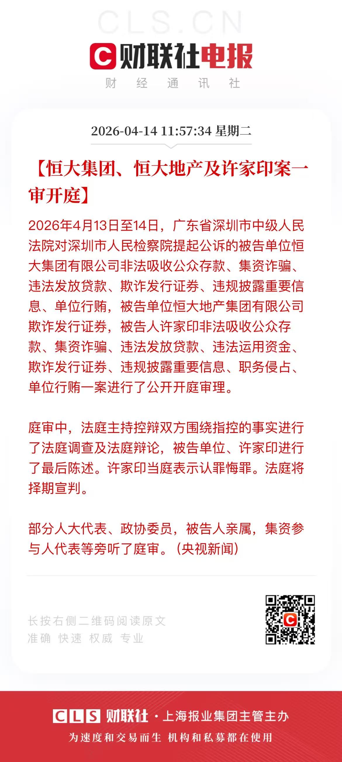2026.4.14 恒大集团、恒大地产及许家印案一审开庭,许家印当庭表示认罪悔罪,法庭将择期宣判。