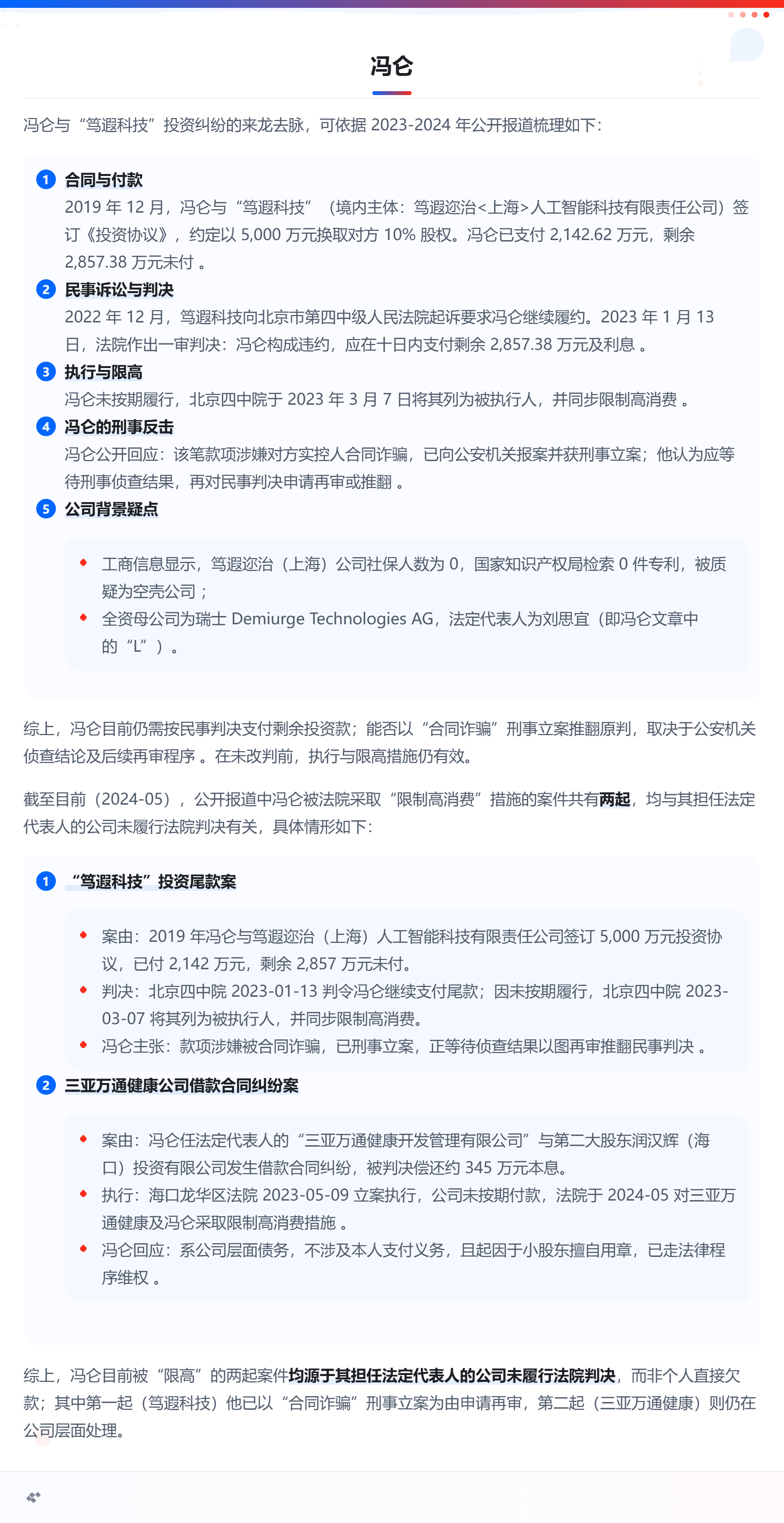 今天看了冯仑《人生的逻辑》,看了几个章节 剩下看不下去了就略过了。我对他其中一个章节《骗子的逻辑》里面他被骗的经历感兴趣,这些大佬一辈子也吃了不少亏,他前几年被2个人忽悠了 自己投了2000多万 这个是实打实的打水漂了,人家躲在国外不回来,还反诉他要尾款,法院判他输没执行尾款,被限制了高消费。玩鹰的也会被鹰啄,面对不懂的行业还是被人家忽悠了,好在及时止损。