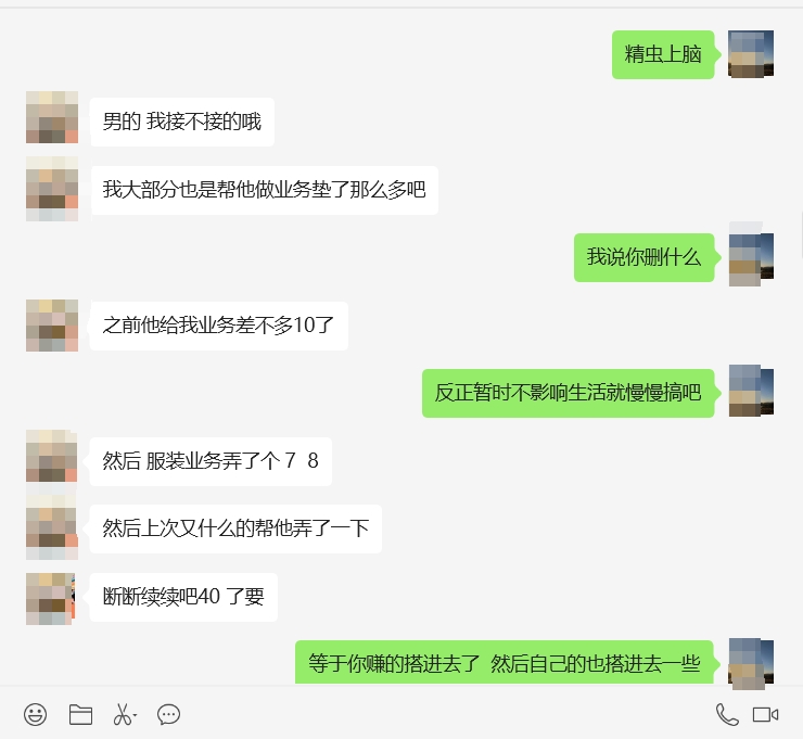 我做网店的时候,那时候也会有电商交流群,也有一些聊的来的网络朋友,大家都是做电商的,那时候经常在群里吹吹牛逼,交流交流行情技术,就像现在做投资一样也有交流群。有个叫仔仔(匿名)认识超过10年了,我是从他没结婚的时候就认识了,现在都有2个娃了。他是浙江苍南的,最开始大学毕业给人家打了一会工,后来就自己出来做网店了。最开始卖的什么产品不记得了,后来卖儿童的秋衣秋裤,就那种冬天打底的衣服。我那时候是一个人单打独斗,什么都自己干。他有老婆 家人帮着干,我也非常羡慕当时。行情正常一年赚个10-30万没问题。后来我2019年初不干电商回老家了,他那个产品也不做了,他们当地有做那种包装袋的,就是各种奶茶包装袋、镭射袋、帆布亚麻袋子之类的,在口罩那几年也蛮赚钱的,特别是刚做的时候,利润高有时候一笔订单就是几万的利润,我清晰记得那一年赚个30-40万都正常,非常羡慕。口罩那期间做口罩都发财了,他也去囤材料后来可能亏个10来个。我网店不做之后做的几件事他大概都知道,包括我2024年去打了几个月螺丝。我炒股他是知道的,包括现在赚钱。昨天又突然找我聊了会天,说最近行情不错吧,赚了多少,我说还可以。他有几个同学也炒股有个小群,他是没本钱,钱都拿来换房子和家庭开支 做生意用了,想炒都没钱。聊到最后 他跟我讲 帮一个客户前前后后垫了40个进去,他从这个客户(女)身上赚了10几万,现在是垫四十个回去,,,,妈的,色害人啊,关系还不清不楚的,肯定撩骚了。这笔钱他家里人都不知道,现在自己信用卡还欠十几万。对方的人设是香港人,家里非常有钱。