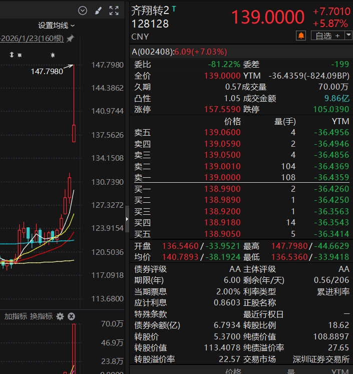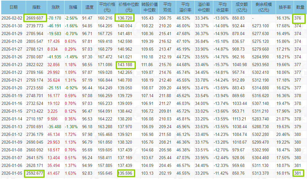 价格中位数 139,我的仓位整体是80%,就按照140以上8成,140以下加满的标准做吧,具体什么变化再看。假使转债中位数能到150我的仓位再多少。26年第一周这种涨法肯定是不利于我们这种散户的,这第二周就是融资保证金80%上调到100%,这2天国家队批量出货控指数,证监会盘后发问,要稳要慢牛。