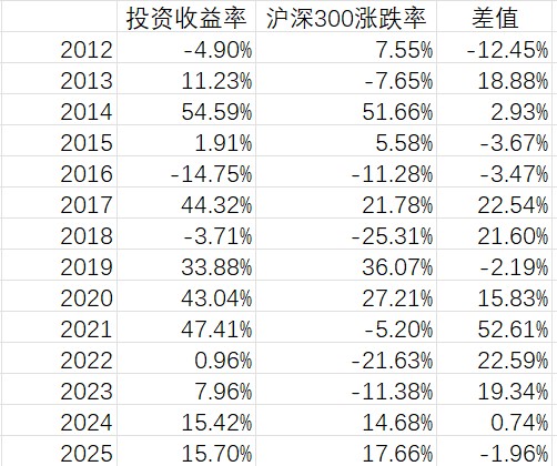 15.7%的2025年度收益率,略低于沪深300增幅。总体差强人意,趁此机会,也把APP里能查到的2012年以来的收益明细一并整理在这里。
