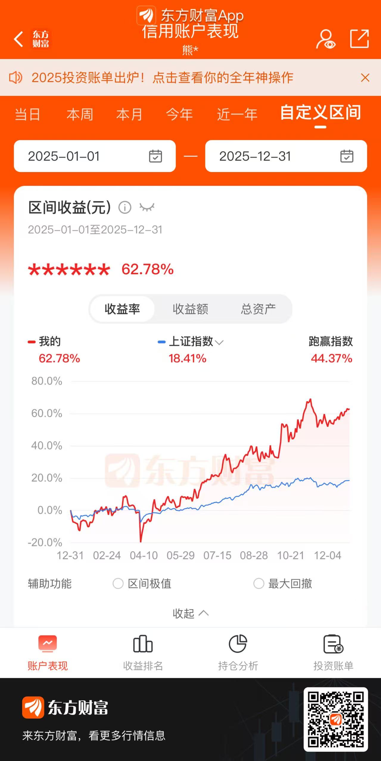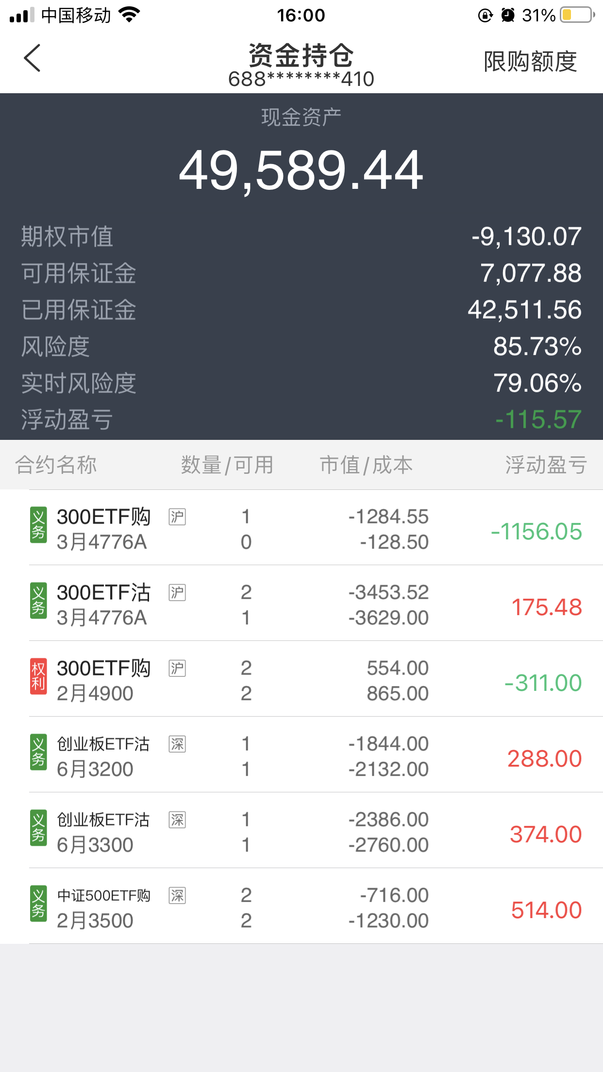 光阴荏苒又一年,过去的2025年是妥妥的股市牛年:在这一年里,自己的股票账户在大幅回血,全年收益率竟然有54.56%,这是2025年1月份的时候想都不敢想的事情,也正是有占资金总量50%的股票账户这一年来的大幅回血,才弥补了期权账户严重落后指数收益的失落感。期权这一年,虽然收益率为4.58%,但主要是得益于全年指数牛市的功劳,这一丁点的收益率,就像集友对我说的那样,风险是银行存款的几十倍,牛市没吃饱,熊市要难熬。确实,风险和收益是完全不成正比的,在牛市里面,股市新手的收益率都能拉自己几条街的距离,更何况是带了高杠杆的期权市场。在年终收益率面前,虽然不亏,但也想过自己是否真不适合在这个市场里面,但心底里那个倔强的自己很快就打翻了这个念想,不打完最后一个铜板就绝不收兵!这几年30%资金总量的期权账户也已经亏到只剩裤衩了,大不了光屁股走人!总结!尽量做跟自己期权账户资金匹配的期权策略,有剩余资金方便在风险来临时做好腾挪和对冲,策略再好,也要掂量自己有没有这个资金实力。提高!还是要多学习,多看书,多请教,不能自己去感动自己,脚踏实地,认清自己的本事,踏踏实实、不急不躁,慢就是快。再出发!2026年,健康永远是第一位的财富,没有好的身体,是无法在变幻莫测、暗流涌动的市场里支撑下去的。在市场中,时刻提醒自己,心中有敬畏,眼中有清醒,脚下有准备;守住本心、稳住节奏以求行稳致远。最后,感谢一路同行不忘忙中指点的各位集友和老师,也祝愿各位集友在新的一年里平安健康,账户长红,马到成功!