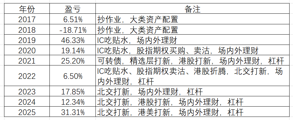 今年的主要收益来源和去年类似,包括北交所打新、港股打新、场内外理财,此外增加了美股打新,然后几乎把杠杆用到了极致。