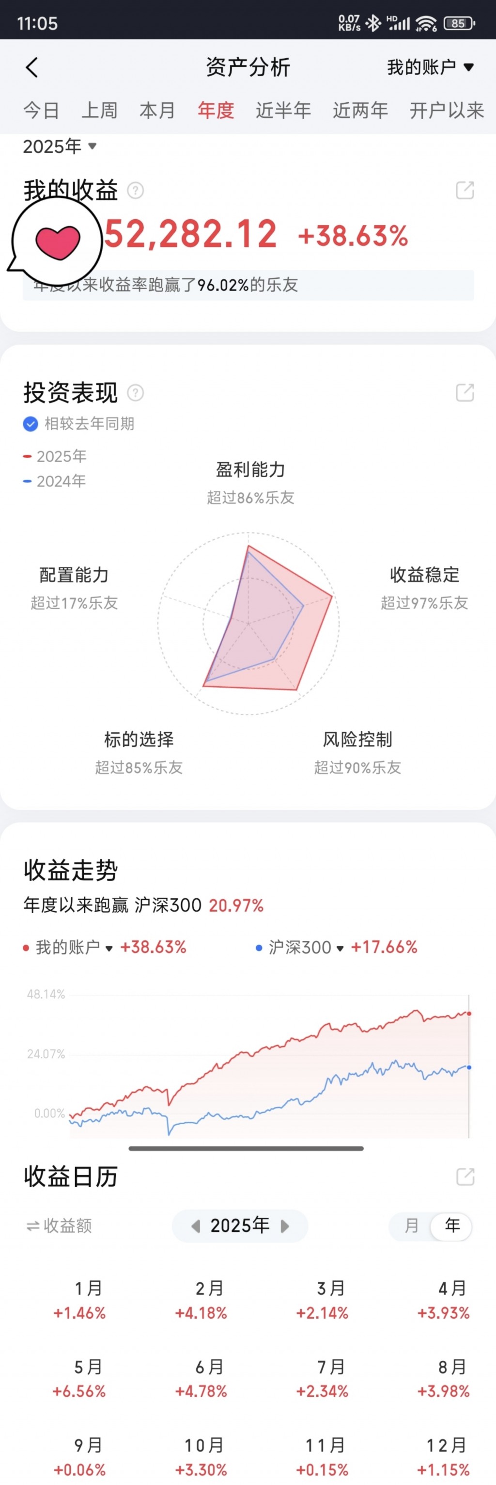 简单总结一下。2025年我账户的表现相当稳定,全年12个月无一亏损,除4月7日亏损约5%、11月21日亏损约2%之外,几乎所有交易日的净值波动都在±1.5%以内,最终的收益率为39.6%。主账户收益图如下: