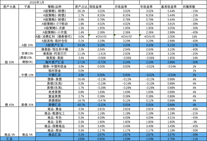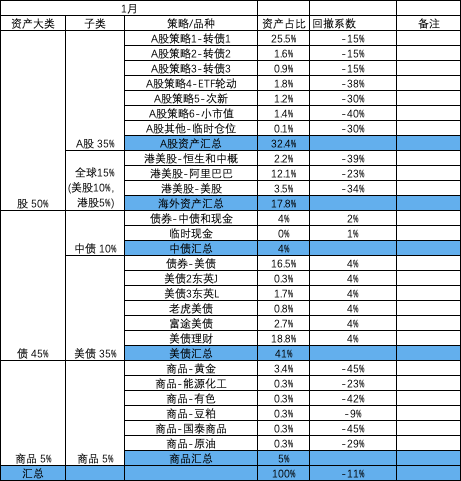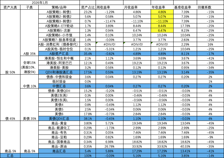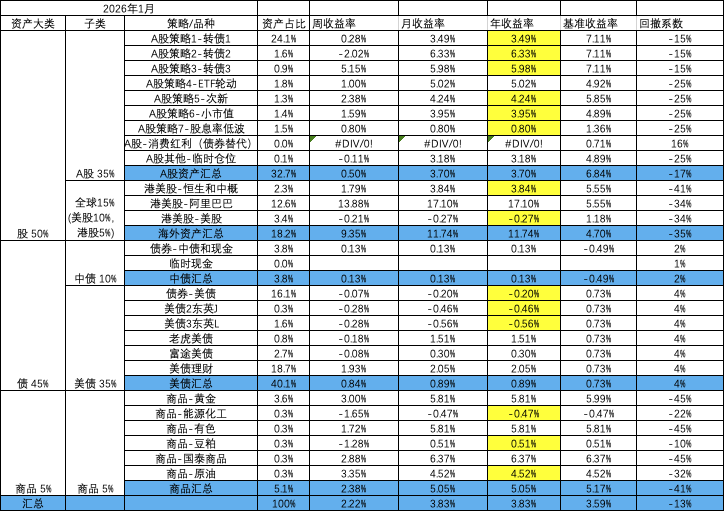- A股策略内部:小市值,ETF轮动和次新均固定金额,盈亏均由转债再平衡