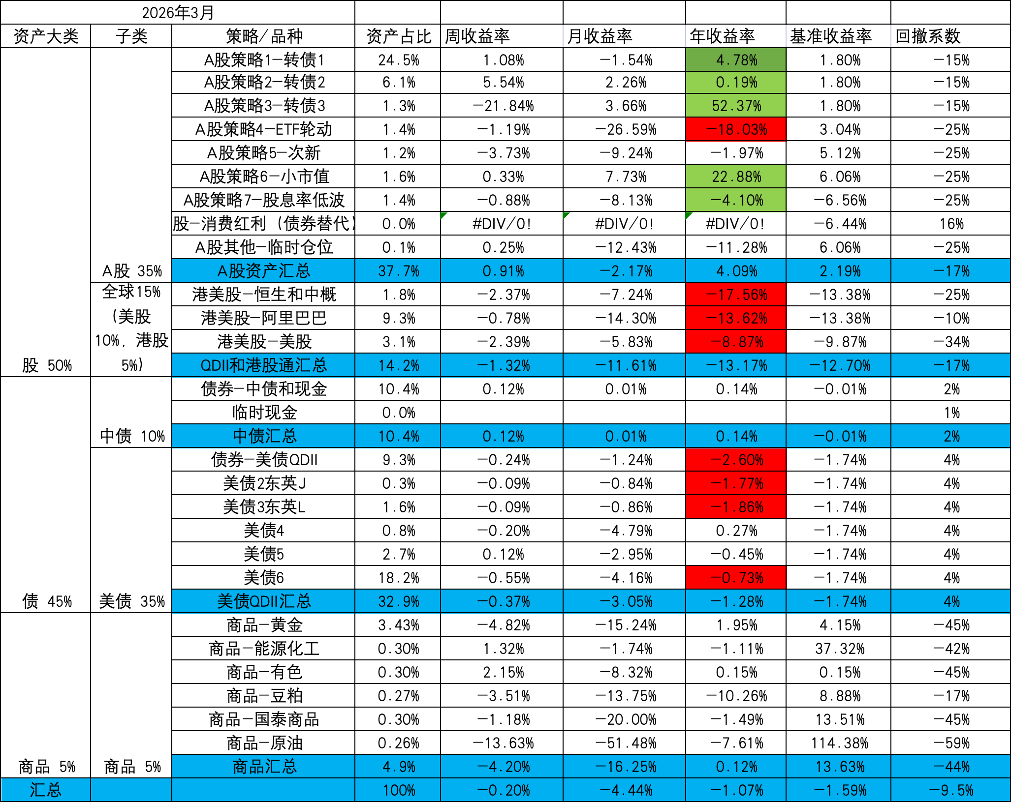 - A股策略内部:小市值,ETF轮动和次新均固定金额,盈亏均由转债再平衡