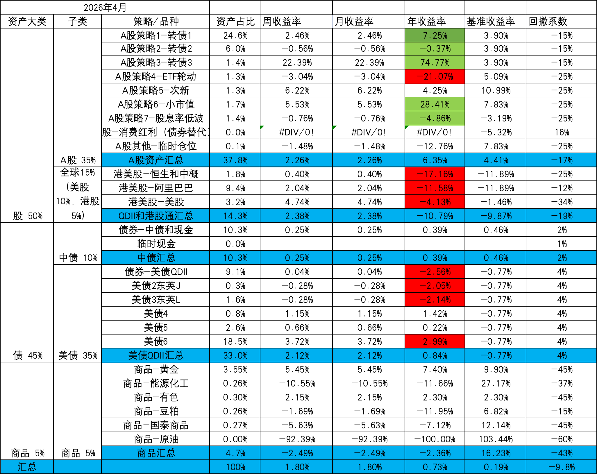 - A股策略内部:小市值,ETF轮动和次新均固定金额,盈亏均由转债再平衡