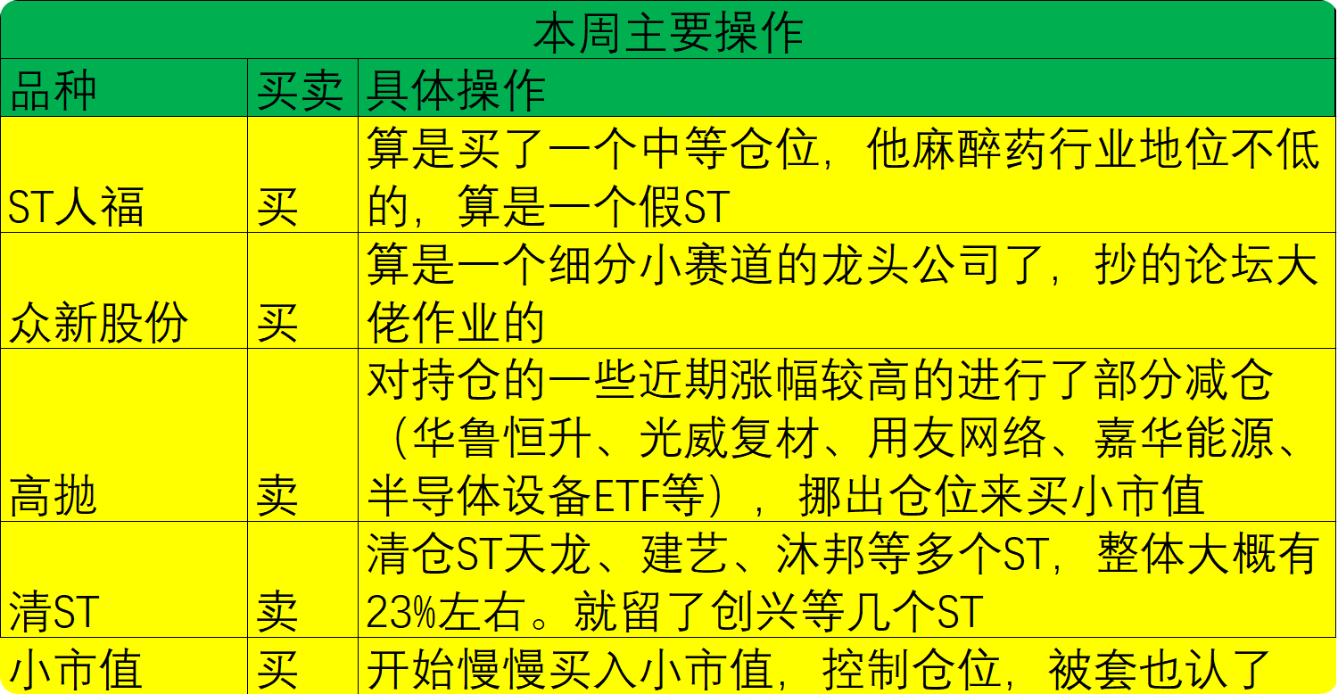 本周的操作挺多的。主要是对一些ST进行了清仓,就留了几个关注比较多的ST。同时,开始在慢慢建仓小市值。