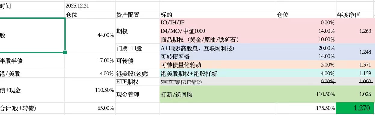 26年展望:继续以可转债、期权为主,稳中求进。大仓位耐心等待机会,当遇到涨跌不对称, 投入更多仓位。以期权买方的博弈极端情况下反转。加大风险偏好,切入小市值策略,跟进大题材的机会。期望收益10%,股指转债高位,降低期望,稳健复利。