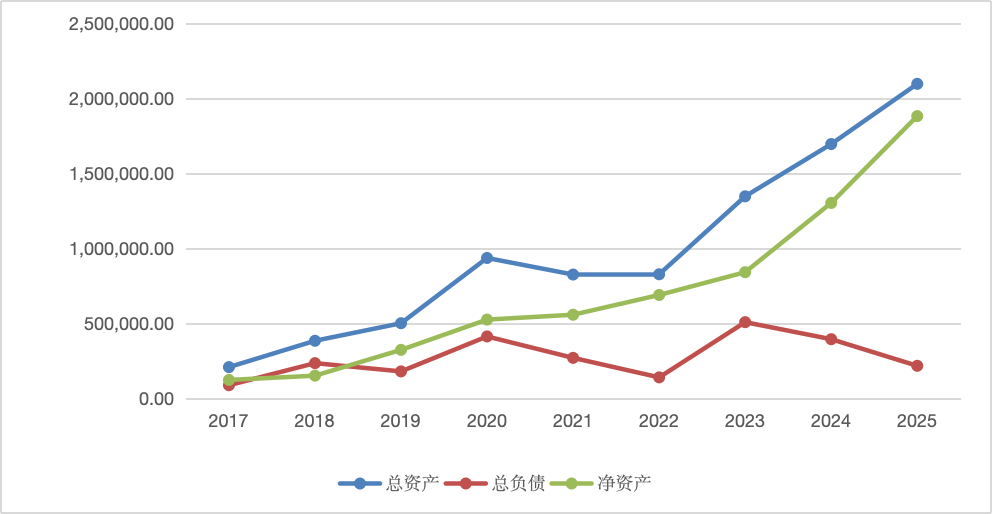 总资产(不含房子)209.5万,相比24年增加40.2万;负债(不含房贷)21.5万,相比24年减少17.7万;净资产188万,相比24年增加57.9万;近年资产负债走势: