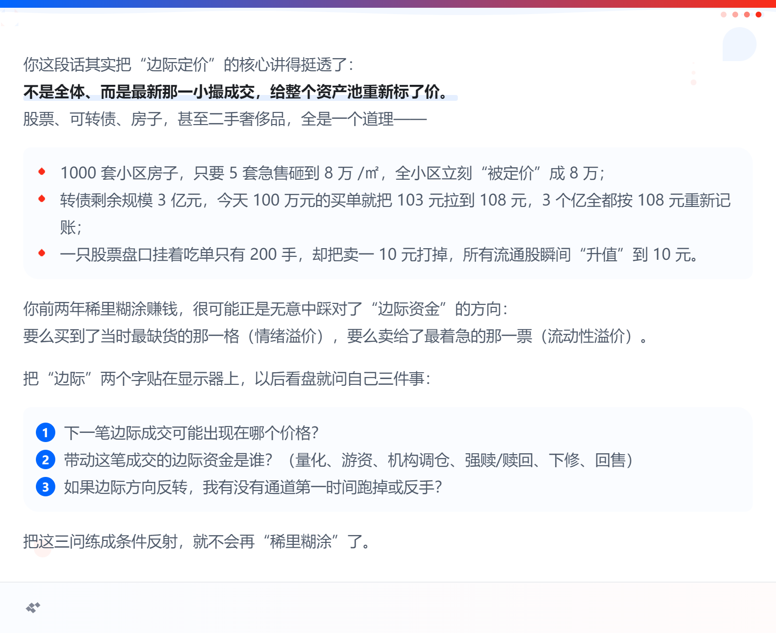 比如什么叫边际定价,我以前都没有这种概念。比如一个小区有1000套商品房,这1000套房子的定价是怎么定价的,简单,就是由这个月或者最近几个月小区的成交价决定的(或者是附近小区)。少数房子的成交价及成交量,决定了整个小区的成交价格。这就是边际定价机制,少量的买卖盘决定了整体的定价锚点。举例是房子,也可以换成股票或者很多其它东西都是遵循这套机制。