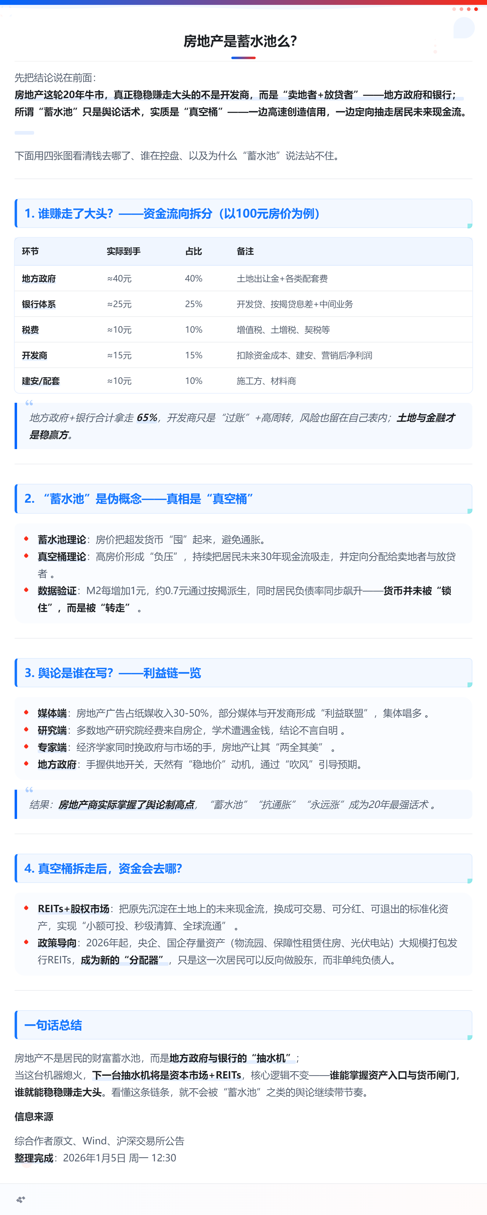 我不知道蓄水池这个概念为什么会流传甚广,这年头就没人会去翻翻货币银行学教材么……房地产通过30年代的个人贷款,一次性锁住了未来30年个人的工资,相当于就是把一个人的现金流蓄水池一次性给储满了。这应该是大部分人理解的戏水池吧。