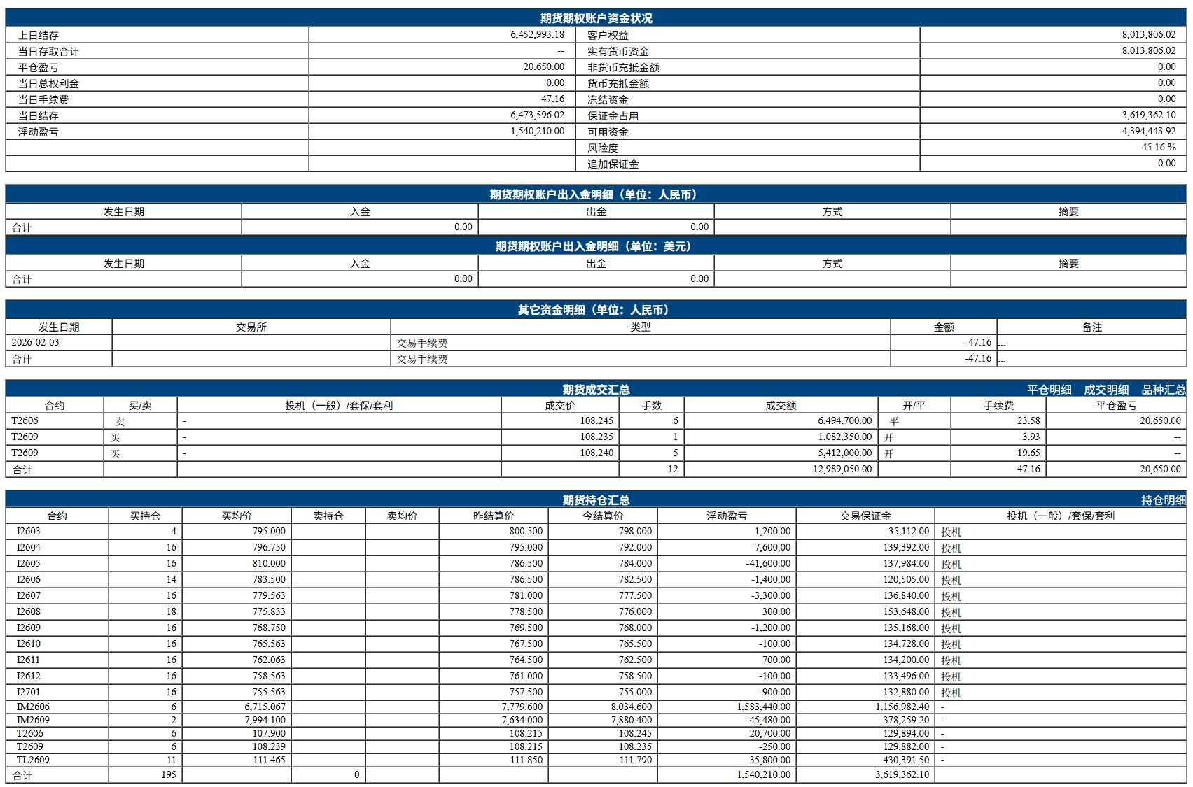 • 防御性配置:当股票或商品市场出现大幅波动时,国债期货往往呈现避险属性,与另外两个品种形成天然对冲。50%的配置比例为组合提供了强有力的下行保护。