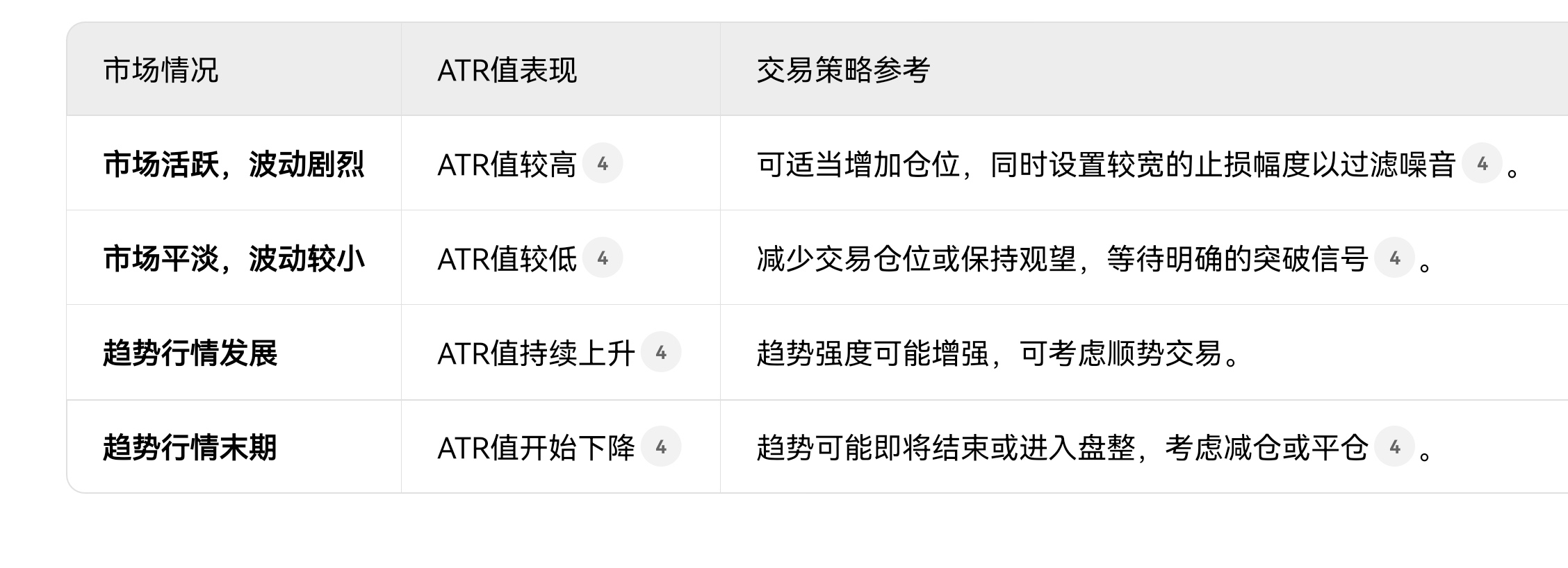判断市场状态:通过观察ATR值的绝对水平及其变化,可以判断市场的活跃度。ATR从低位开始明显放大,常是趋势启动或加速的信号。