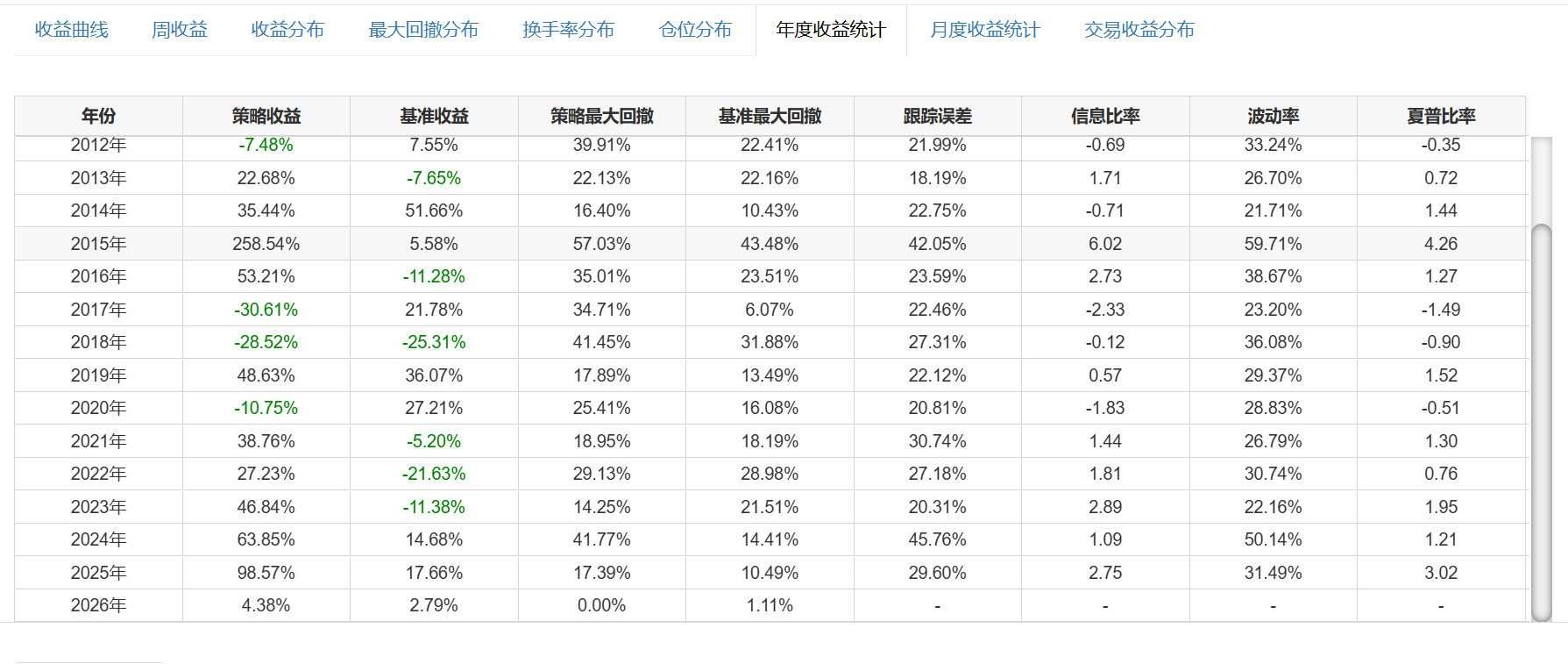 其中2012年收益率为-7.48%,2017年收益率为-30.61%,2018年收益率为-28.52%,2020年收益率为-10.75%。