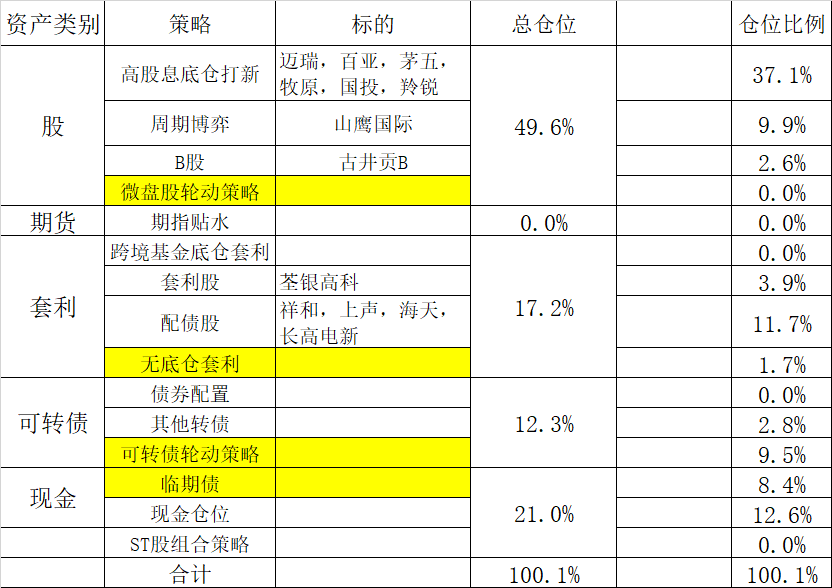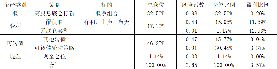 套利贡献收益率2.75%;指数基金类贡献1.3%;转债轮动贡献2.8%;配债股贡献2.7%;