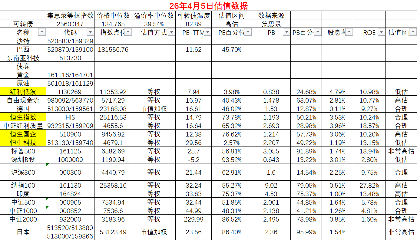2.各个指数整体不便宜,部分指数估值有一定回归,如中证2000和微盘股,但是依然处于高估区间;有吸引力的指数确实也有出现,如红利低波指数,国际指数德国指数和恒生科技指数处于低估状态。不过需要提醒自己的是,高估未必马上下跌,低估也未必立刻上涨。整体市场受到中东事件影响,尚未脱敏。美国的纳斯达克和标普500指数显而易见的高估区间,可能存在一定的系统性风险,主要是中东事件导致油价长期高位带来全球经济滞涨的风险,另外中东资金短缺和美国私募贷款的流动性缺失可能导致美股AI科技板块崩盘的风险再加大。市场对A股原油煤炭类资产定价波动大且混乱,投资者在3-4月跟随市场有些混乱。