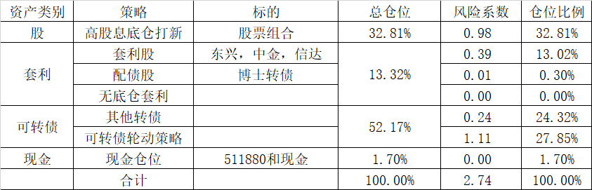 套利贡献收益率2.75%;指数基金类贡献1.3%;转债轮动贡献2.8%;配债股贡献2.7%;