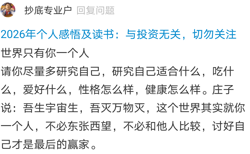 关于经营财富。投资致富孜孜以求。经济基础是实现自由的基本条件,也是提高自我社会认知的途径,亦是自我实现和兴趣所在,故要牢牢树立把投资作为事业而不是赌博的根本观点。坚持走正道,赚认知钱,做正派人(重复去年的话)。今年权益投资录得37%的赢利,全年上证指数18.41%、上证50指数12.9%、沪深300指数17.66%、中证500指数30.39%、国证2000指数-32.16%、创业板指49.57%。感恩2025,以自己的认知能得到这个收益率,自我已经满足,有模糊的正确,也有运气的加持。最后一个季度投资策略与市场风格不太合拍,也有像打新老师的些许犹豫迷茫,没有找到适应市场更舒服的姿势,这也许就是市场中的常态吧。学会敬畏市场,拓展能力圈,行稳致远。
