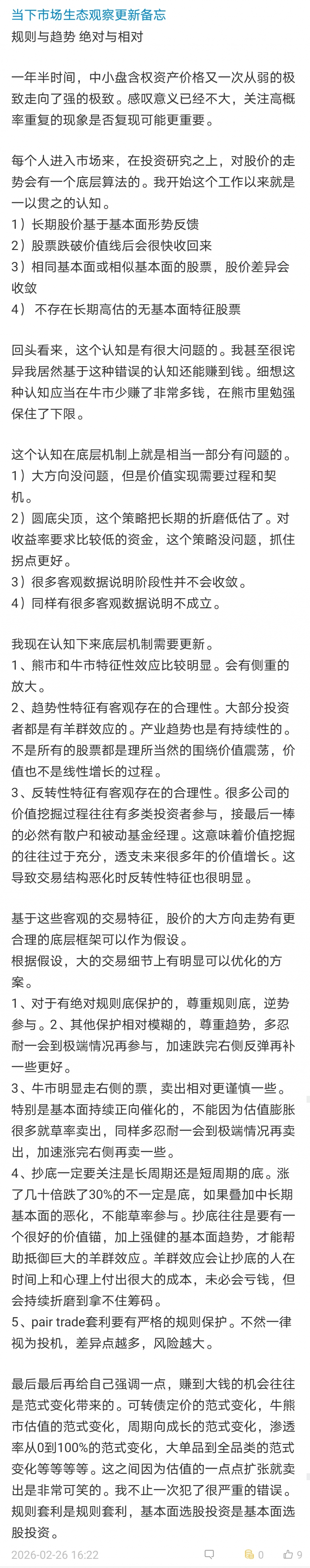 这个保证了投资的下限,不管发生任何极端事件都不会太差;而且防止了对某类资产过于主观的判断,在买入任何资产之前都会先假定自己是错的。抓住主要矛盾的同时,也要想好什么条件下目前的交易可被证伪。