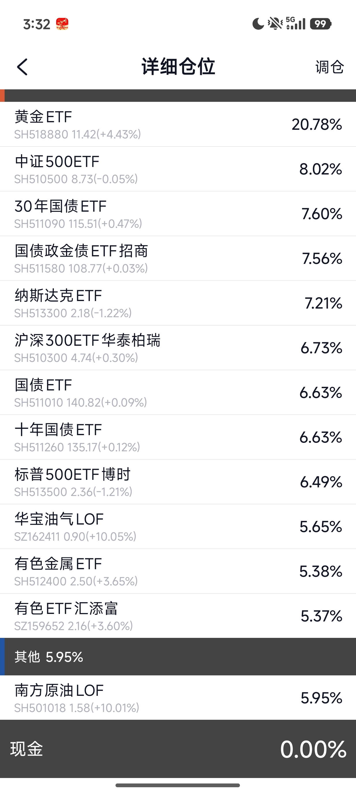 黄金LOF一直是负溢价,再结合达利欧的最新言论,开始有意识的增配黄金仓位,将A股和美股的持仓按照哈利布朗永久组合来配置(因为我开始发现我折腾出花来也跑不赢哈利布朗永久组合)。