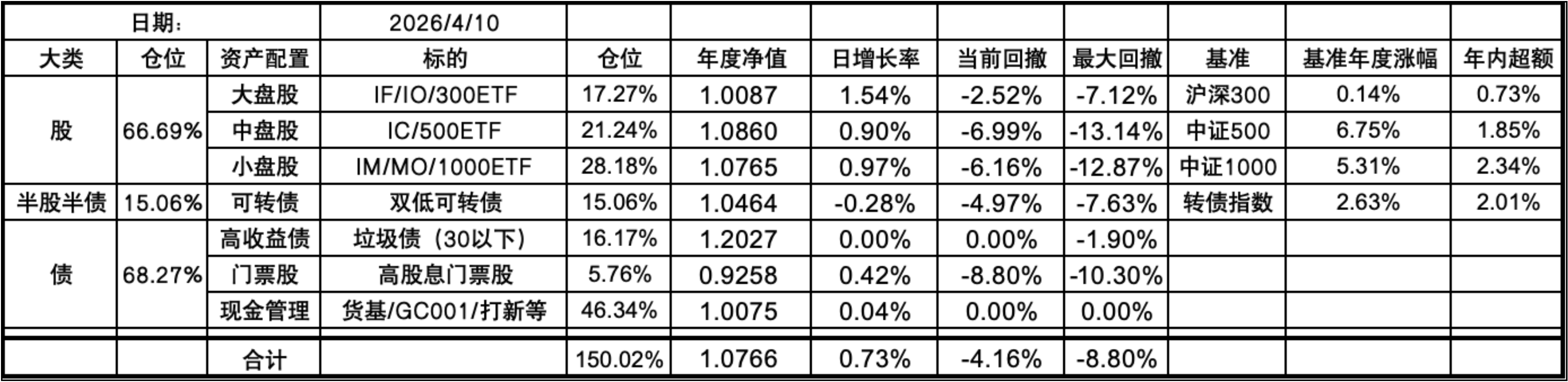 今年的持仓和去年底没有什么变化,微微加仓了点垃圾债,其实就是万科债,由于年底也未主动做平衡。这样持仓继续是7个葫芦娃了。未来一年大概率整体依然是坚持不择时、不深研选股的买入、持有、平衡、套利的策略,投研精力继续放在债端的各种低风险策略上。权益类等效仓位最高不超过100%,固收类则不超过80%,杠杆率控制在130%~180%之间。