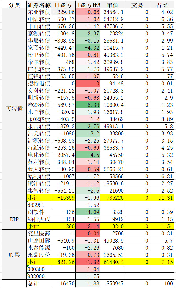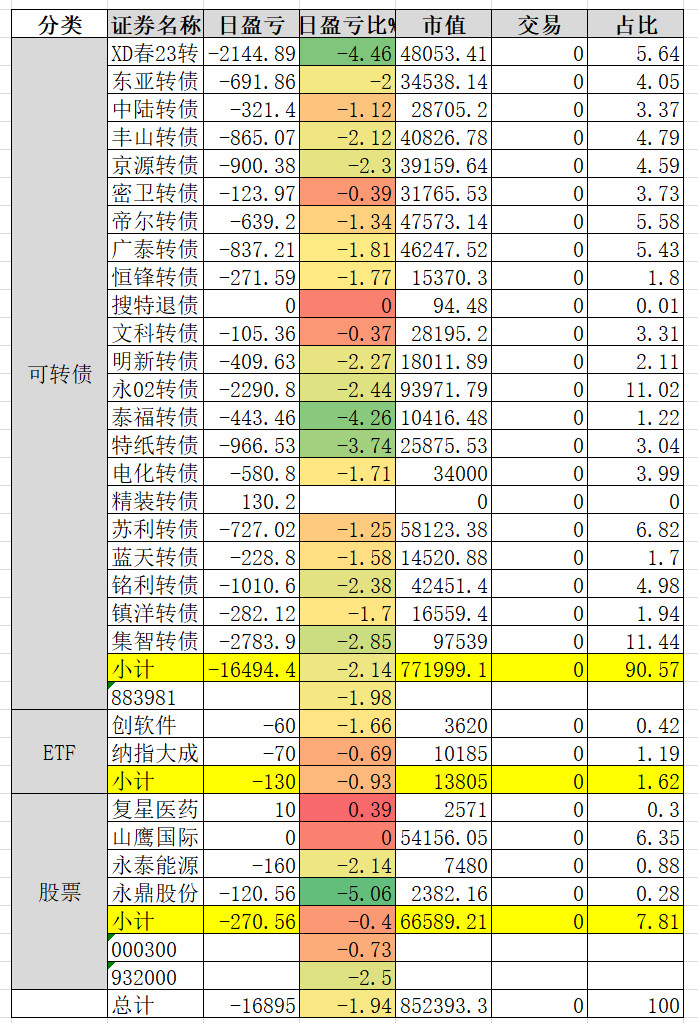 3、本月亏损较大-8.94%,可转债指数跌-8.63%。需改进的: