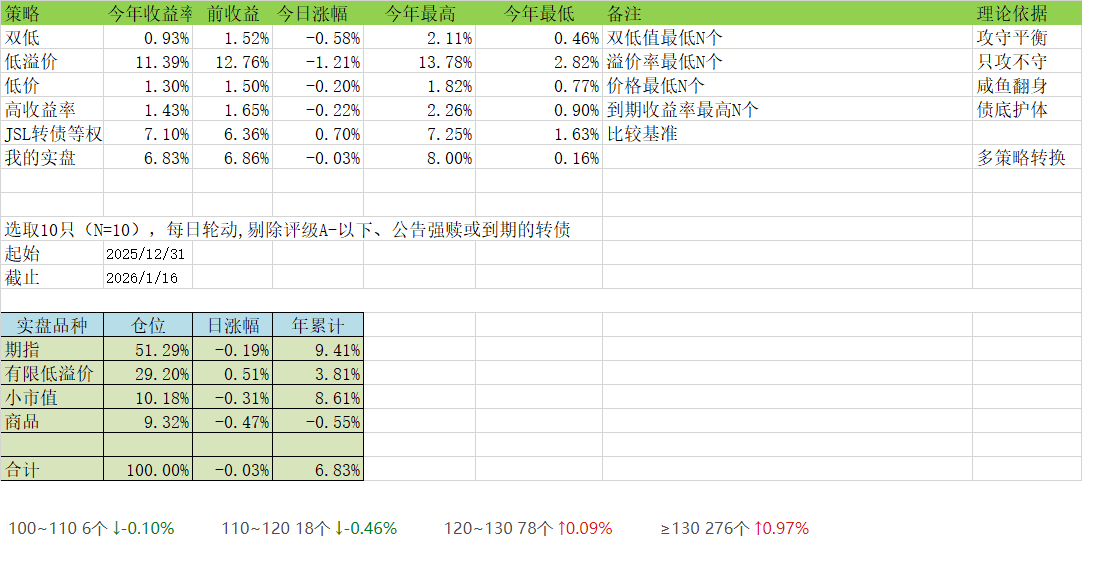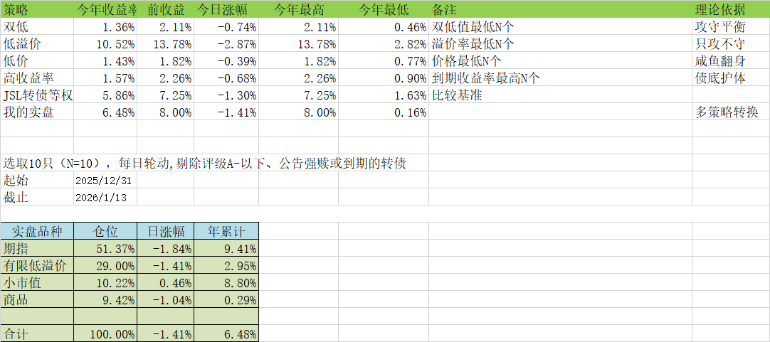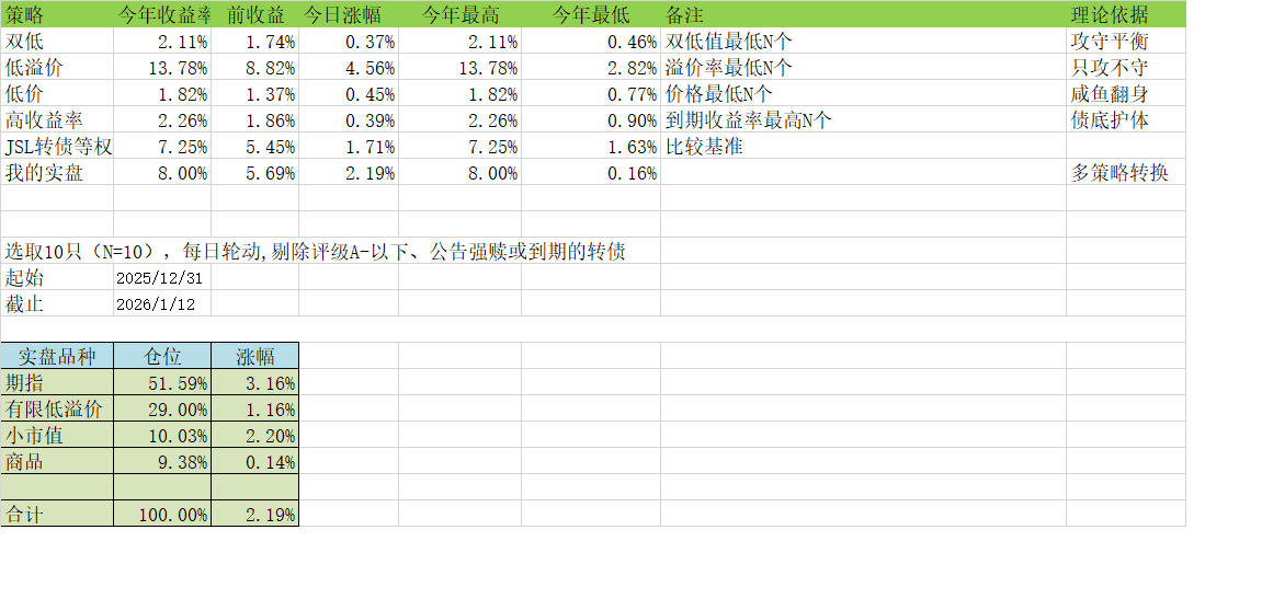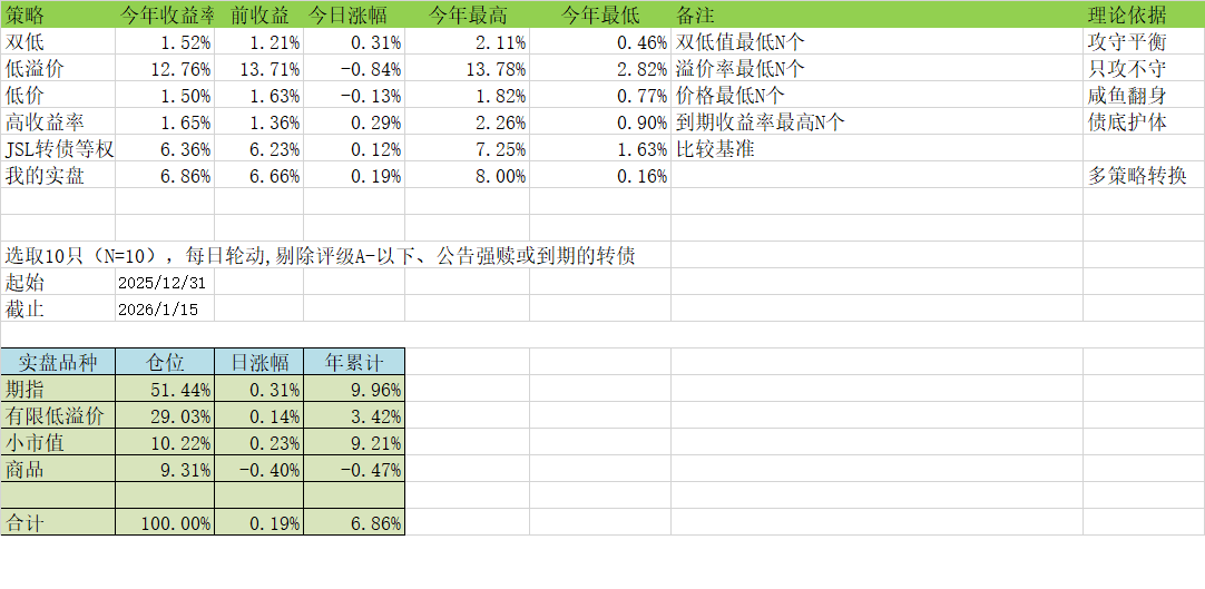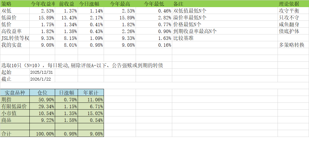 大佬,您这个低溢价策略我感觉应该没有实盘,因为我完全按照低溢价和你的选股方法做了量化策略,差距非常明显,今年至今收益率只有6点多,而你统计的是18点左右,我关注另外一个公众号的低溢价也是在6-7的收益率。实在想不不明白差在哪里。你没看懂,低溢价我很久没做了,我的实盘中是”有限价格的低溢价“。四个策略只是计算而已,由于交易成本的设置不同、有时数据差异造成选出标的不同而造成累计收益有所差异。这不重要,只是一个观察结果,没有多少人会一直坚持做纯的低溢价吧,毕竟价格太高、波动太大。