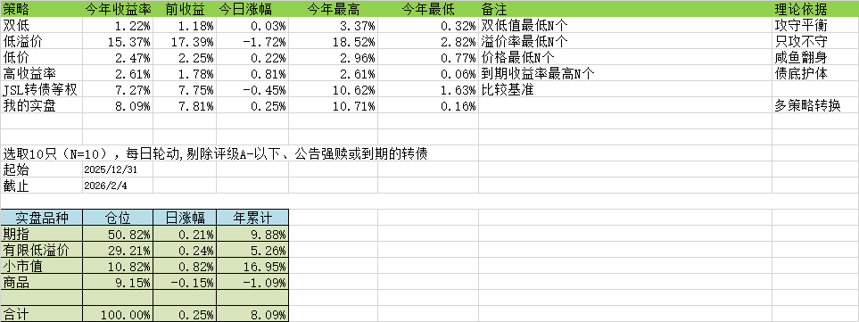 我说个个人感觉,期待楼主确认或者驳斥。从非常久远就跟楼主学习----虽然一直没有学会但也把可转债作为了资产配置的一个必选项。这两年,似乎楼主放弃了“安全”偏移向着“收益”方向行走很远,尤其是今年彻底“向我靠拢”了----宁可要上下起伏的15%也不要四平八稳的8%。可是呢,要挣到那个上下起伏的15%和做可转债又有本质区别,我是真的没看懂今年楼主的四项选择背后的逻辑----如果可以说请一定说说。逻辑就是做多,直到趋势改变。