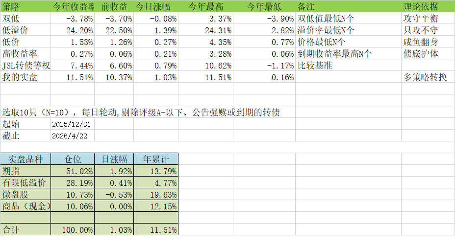 今天以上几种低溢价策略都是负收益,为何你的是正收益?
