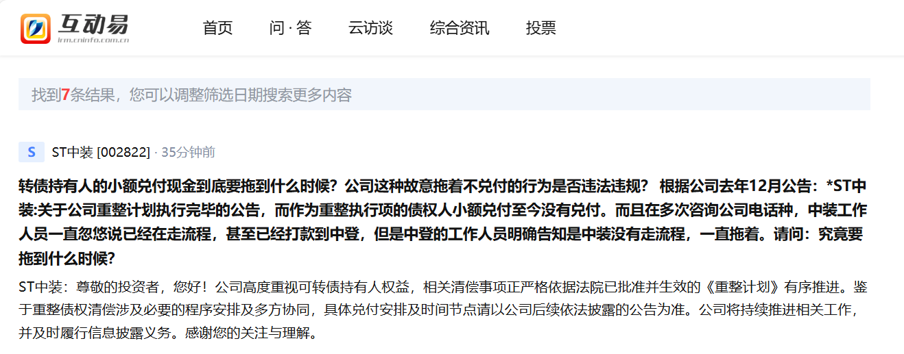 先打的中登,中登意思是他们没法主导进度,主要责任不在他们这边,要中装提流程之后他们才能要求中装打钱过来,希望我们投资者把方向搞对,这两天接到了不少中装投资者的电话,他们也会去催一下中装。