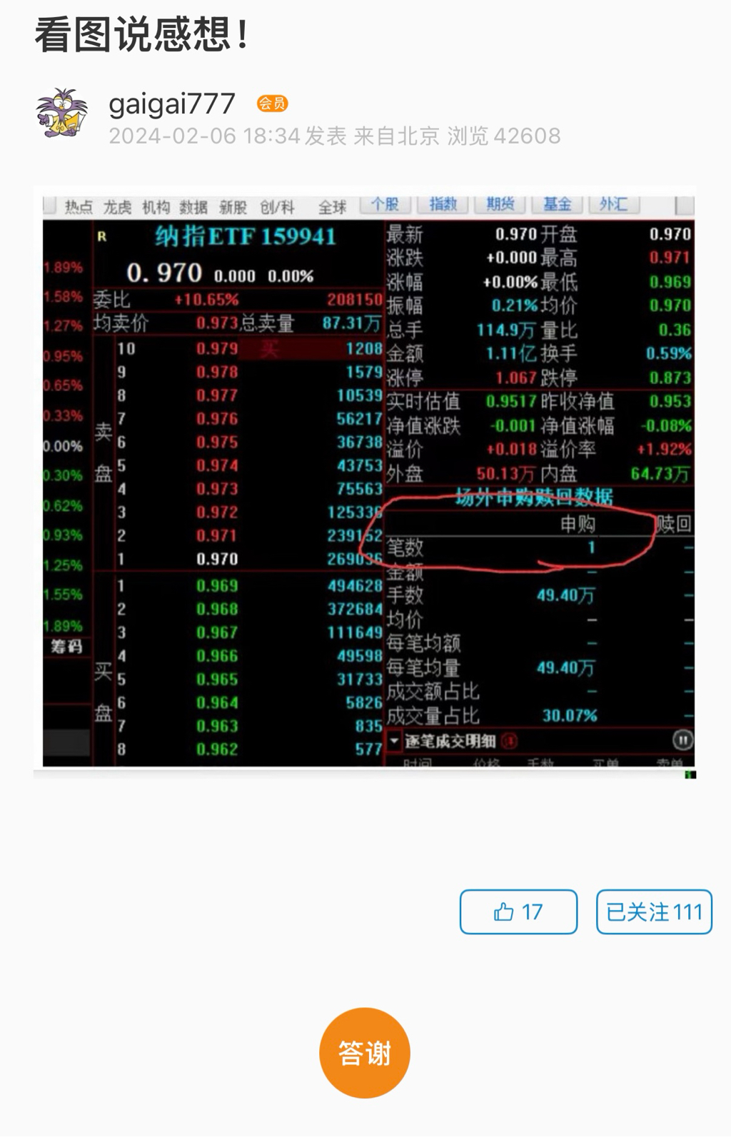 认识的人已经有三个都中了半导体了,中一个100W,普通人可能是一辈子的努力。震撼就在身边,反思就是行动力太差,一直在嚷着弄个道通,也因此发了贴,龙龙大佬也给了指导,终究还是没有在窗口关闭前弄一条通道,败在了执行力上,并错过了最后的疯狂与暴利。而G大,就是在我终日在群里嚷嚷后,果断开了通道,并在两个月之后就收获了半导体的巨肉,还时不时能中上159518、纳指等,其行动力之强、回报之丰令我敬仰与羡慕...也许老哥需要冷静下,