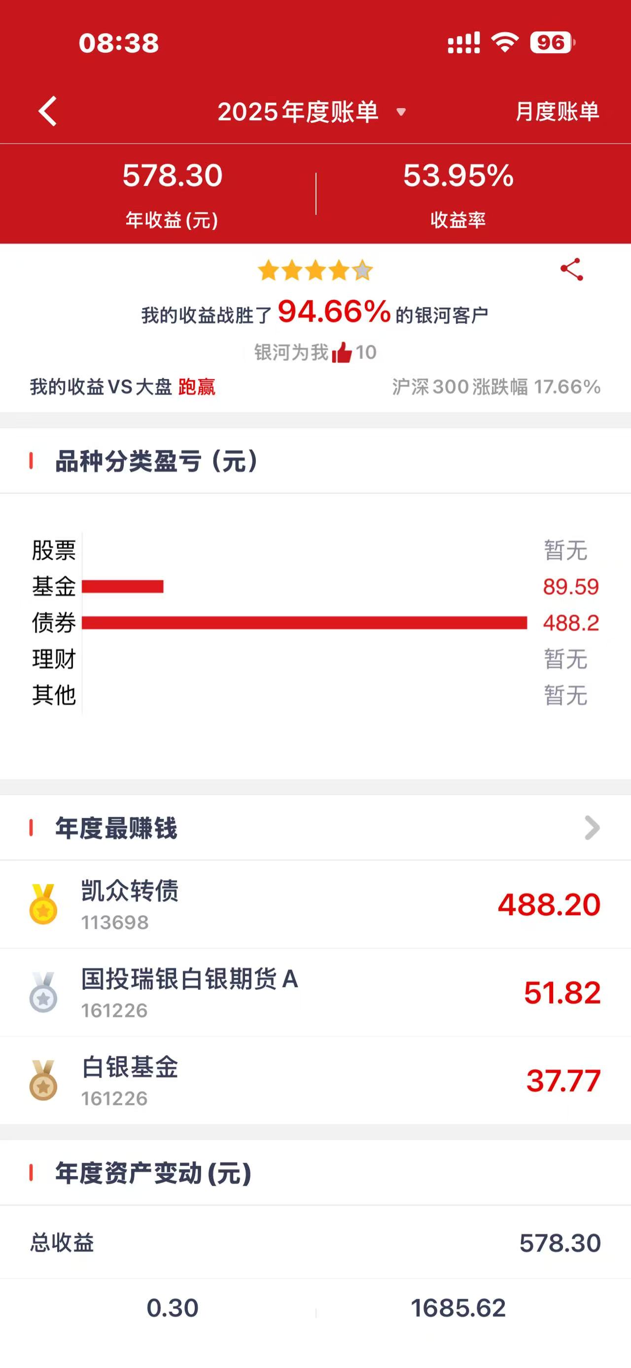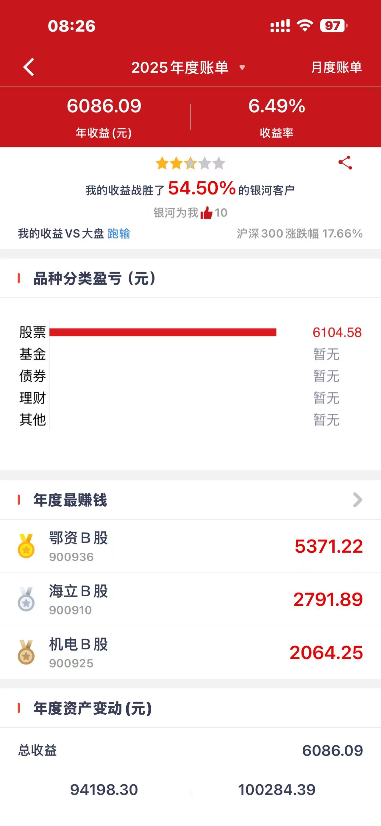 2025年收益率6.5%-54%,有图为证,所有帐户平均收益率处于两者中间的两个黄金分割点之间,至于是多少,你认为是多少就是多少吧...................