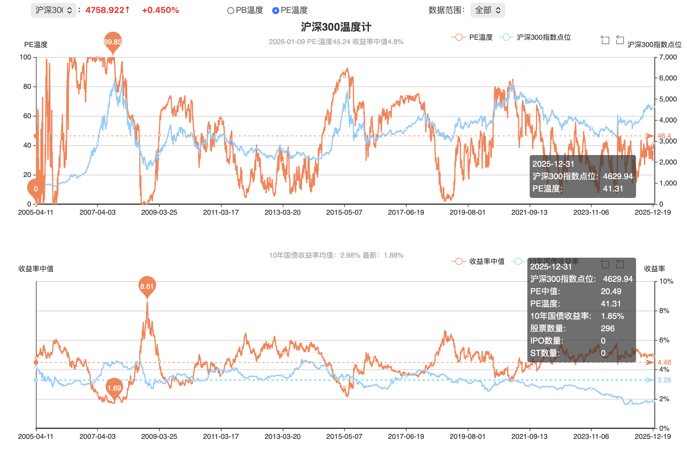 股市的底部是价值投资者和产业资本买出来的,但顶部却很难预测,因为投机资金的涌入,使得顶部有可能涨了还涨。2026年的货币政策还是宽松的,美元还要降息,无论国内还是国外的资金都是宽松的,这使得市场难以跌下去。而且从十年期国债利率看,现在只有1.88%,而历史均值是3.28%,当前沪深300指数的PE中值是20.83,按照1/20.83,沪深300指数的回报率中值是4.8%。看沪深300指数的温度计,可以看到每当这个沪深300指数的回报率中值和十年期国债利率偏离较大的时候,然后两者会相向而行,会趋向于吻合。那么后面的走势,极大可能是沪深300指数的PE中值上涨(也就是估值提升,股市上涨),同时十年期国债利率在原地等着或者反弹一段,然后两者吻合。如果十年期国债利率不反弹,说明经济不好,不能加息;如果十年期国债利率反弹,说明经济复苏,需要加息控制了。假设我们认为最后两条线会在3.3%(历史均值附近),也就是十年期国债利率到3.3%,PE中值到30倍,那么沪深300指数应该还可以涨50%,也就是指数到了7000点左右,此时从PE温度看,温度已经升到99度了,也就是高估的地步了。