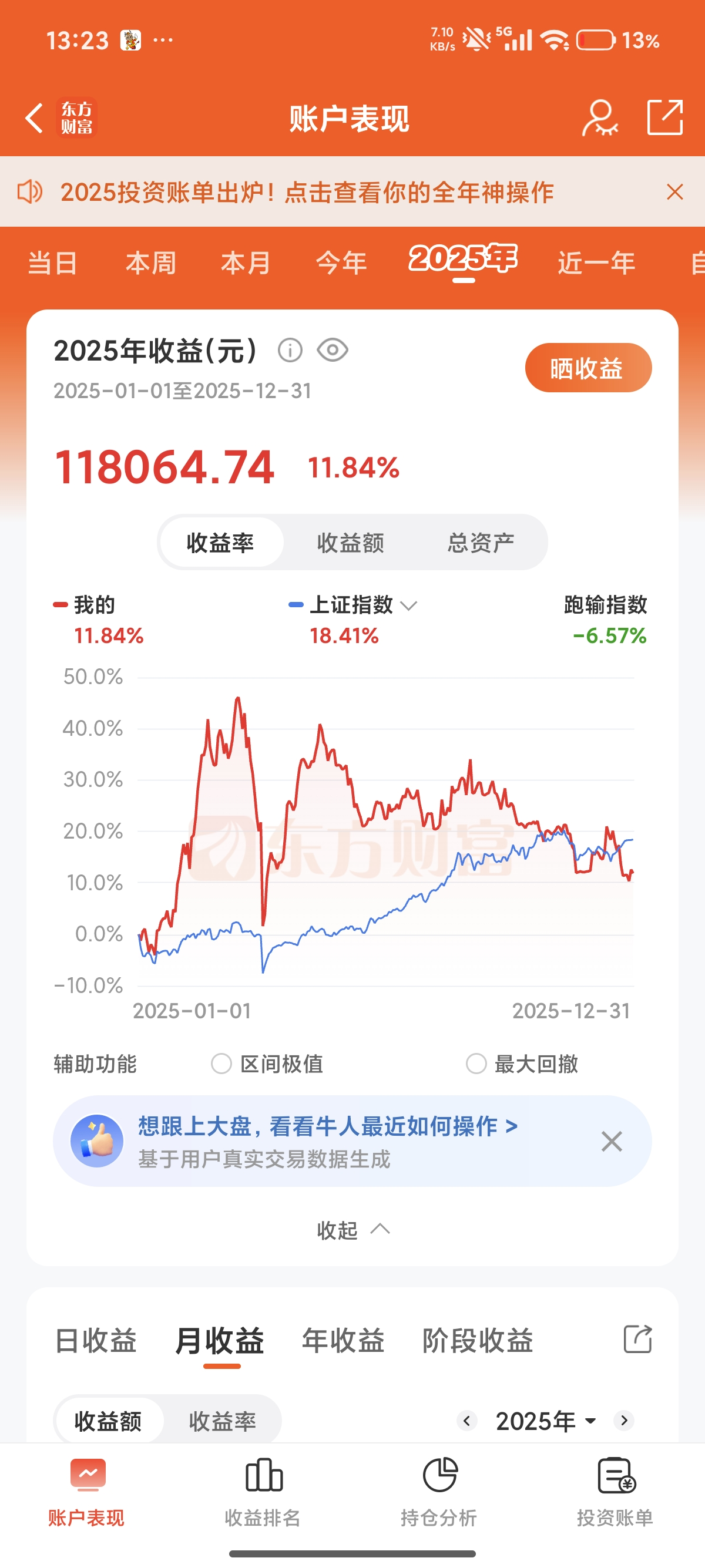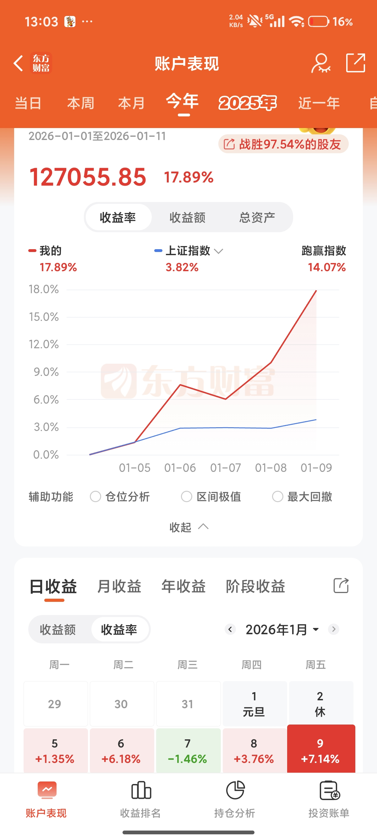 25年的12月中旬时开始改变模式了,12月收益不理想,日思夜想哪里不对劲,坚持到1月有点改善,账户曲线也很好看,周五收盘后心里感觉到不对,并没有多少喜悦,有的是迷茫,难道我以前几年的时间都是在瞎弄?因为这几天是市场好,收益率很不错,无法判断是不是改变模式带来的结果,反而对自己的操作不了解了。如果模式对,那元旦过后这几天收益率直接干了我25年一年的,25年的收益不理想,回撤很大,但还是坚持下了,虽然正收益,但是有很多错误的点,这个我自己是清楚的。如果模式错了,只是这几天市场运气好,那我又要寻找新的模式了。故而迷茫了,看来只有时间替我来解开答案了。有大佬给我看看