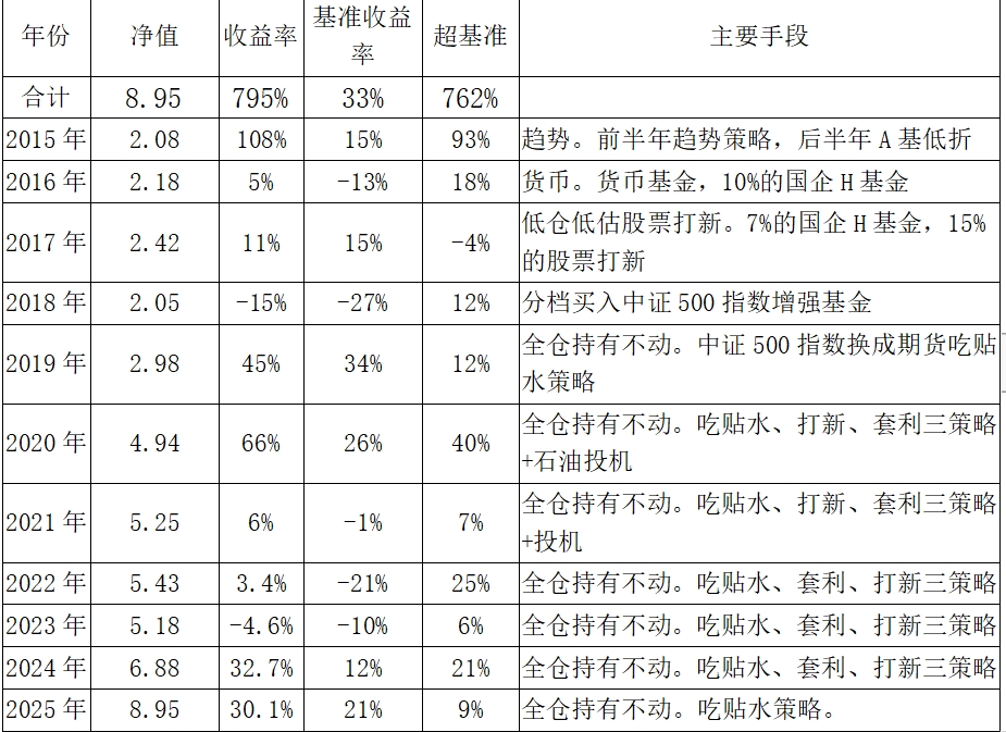 (1)全年维持了2024年底的配置,持仓仍由中证1000(股指期货吃贴水策略)、中概互联基金(套利策略)、股票组合(打新策略)三部分。只有贴水策略还有点效果。