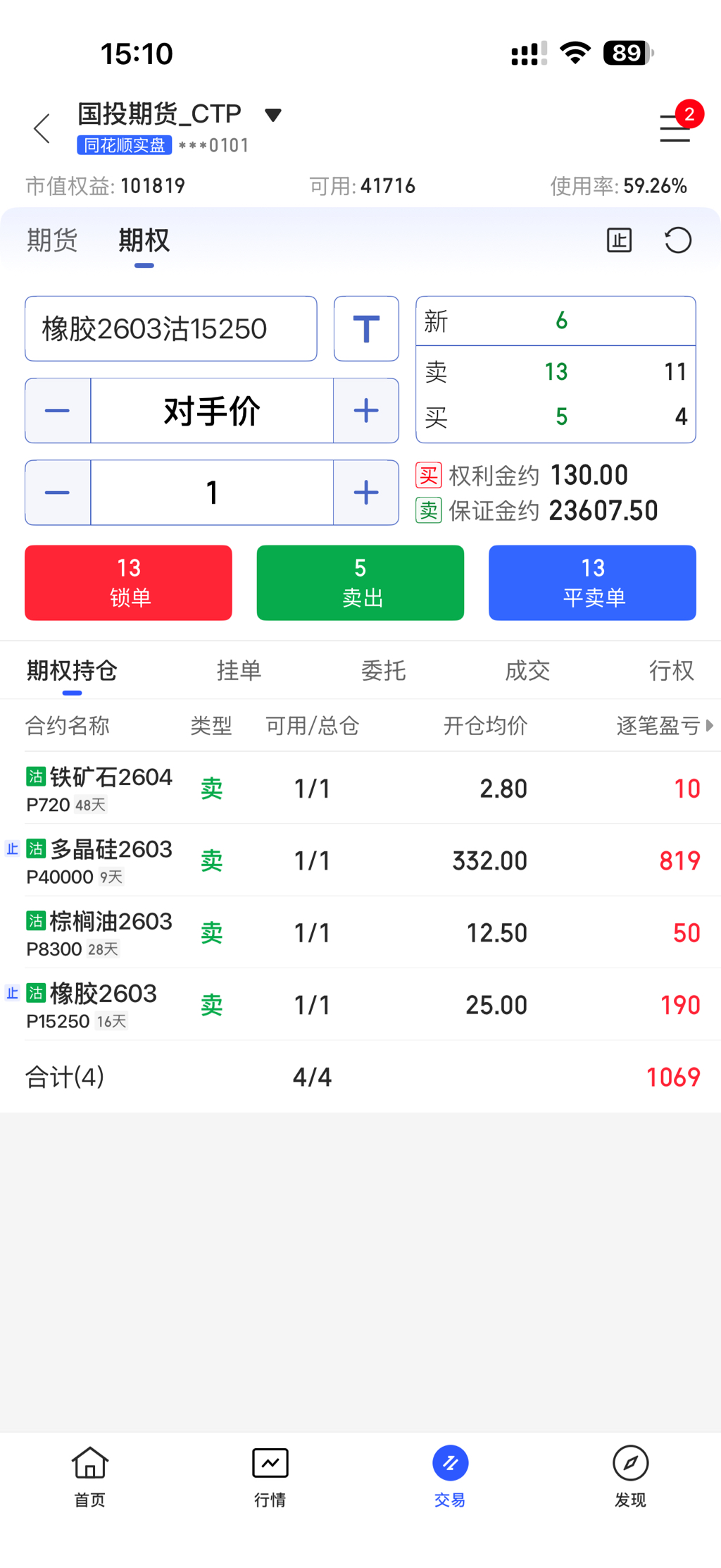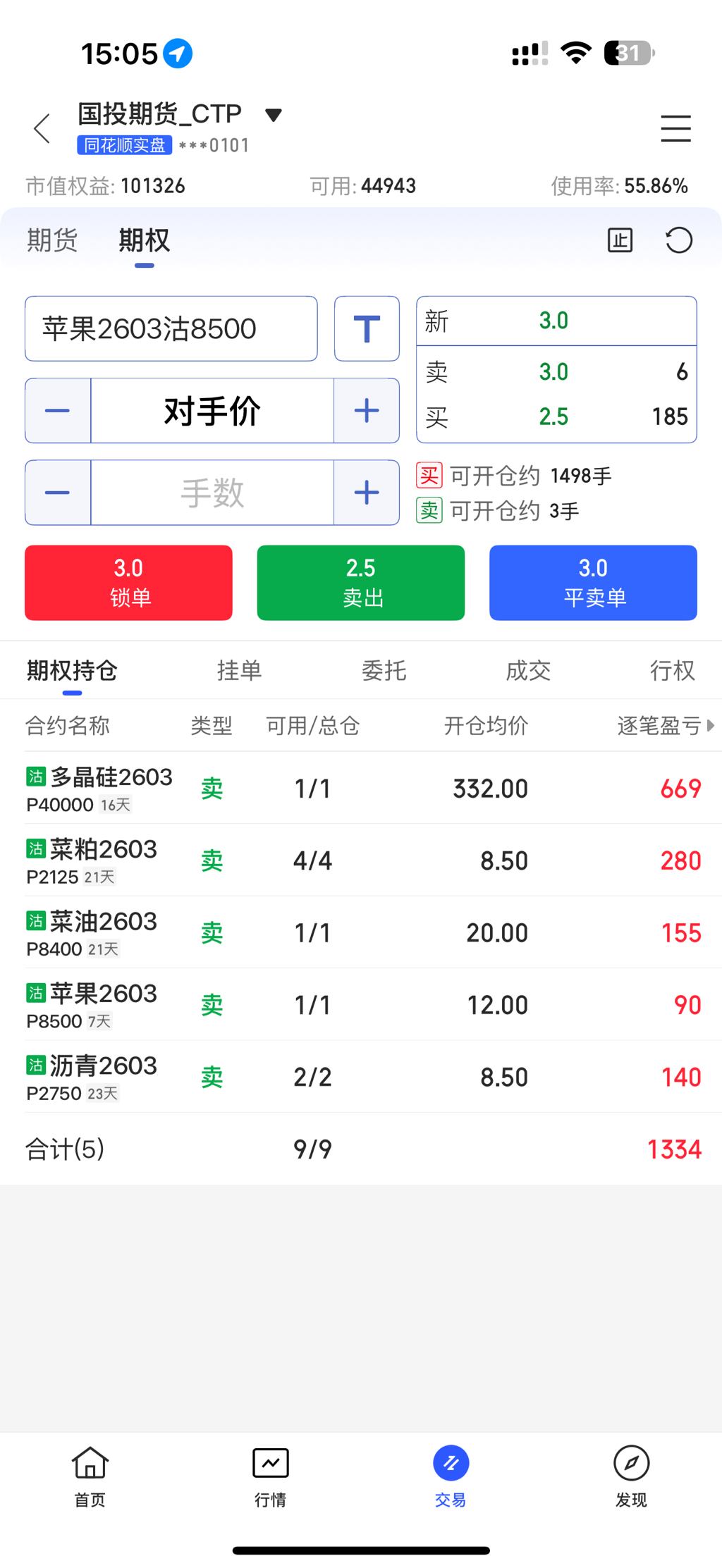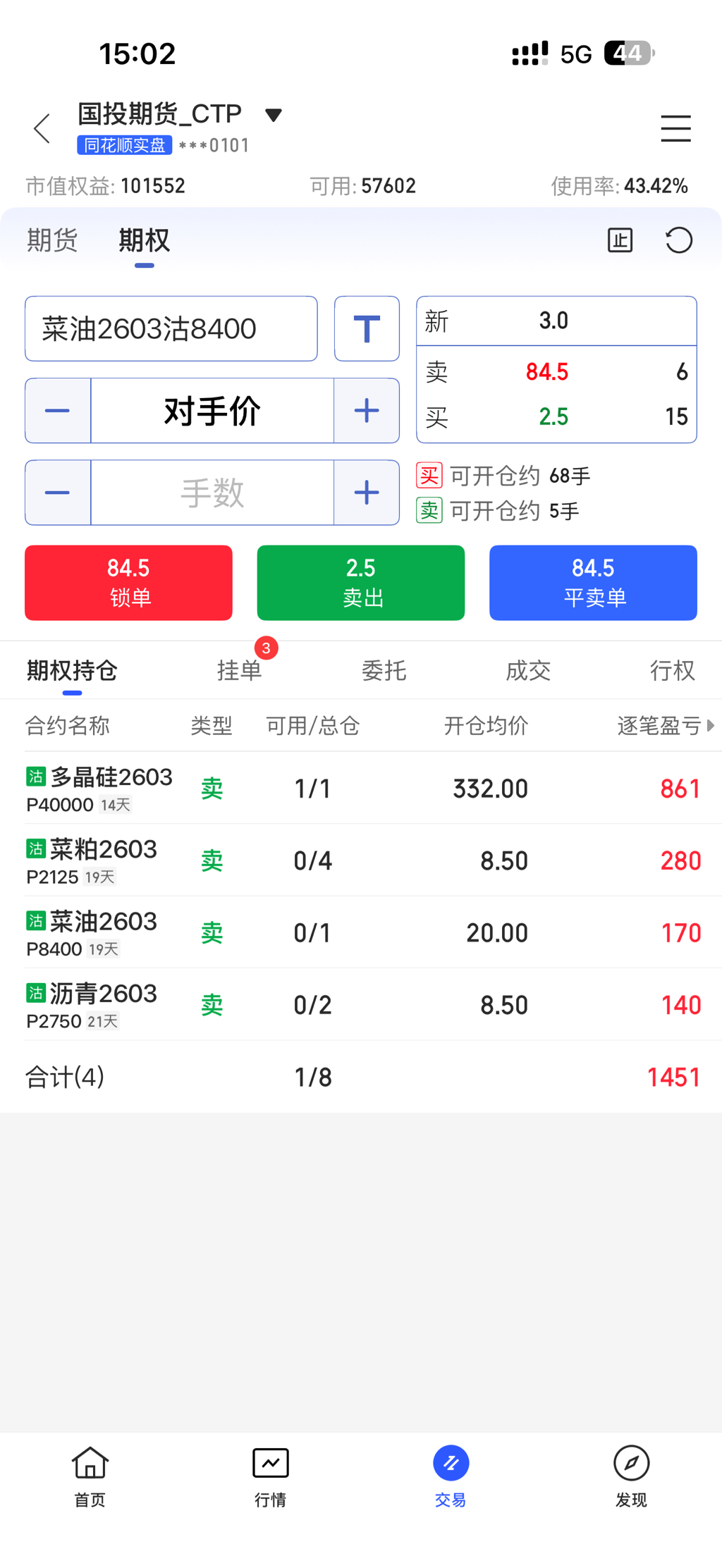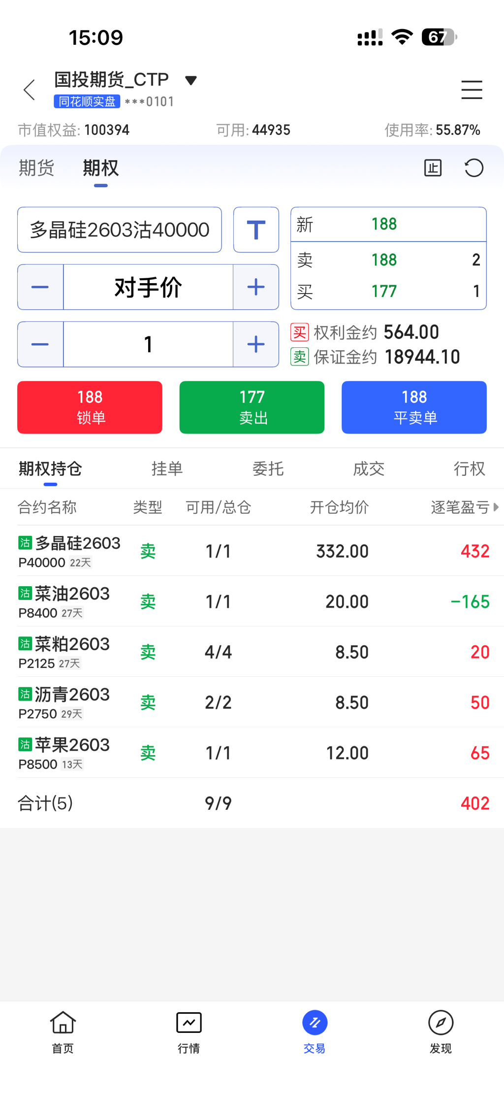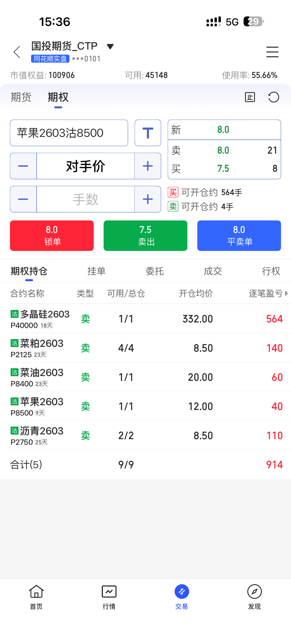 今天实盘:今天盈利40元左右。 今天有特殊操作就是平掉了大部的卖期权,原因是我要出钱去套利去了,现在套利机会太多了。 卖期权是很好的现金池,可以让我在有需要的时候随时移动资金出套利去,这个短时间的收益预期或者说是期望肯定比卖期权是要高不少的,但是机会很少。 卖期权在这个时候起到了很好的我的现金增强的作用。 今天我是转了8万出去,后面当我套利结束,我将转8万回来。