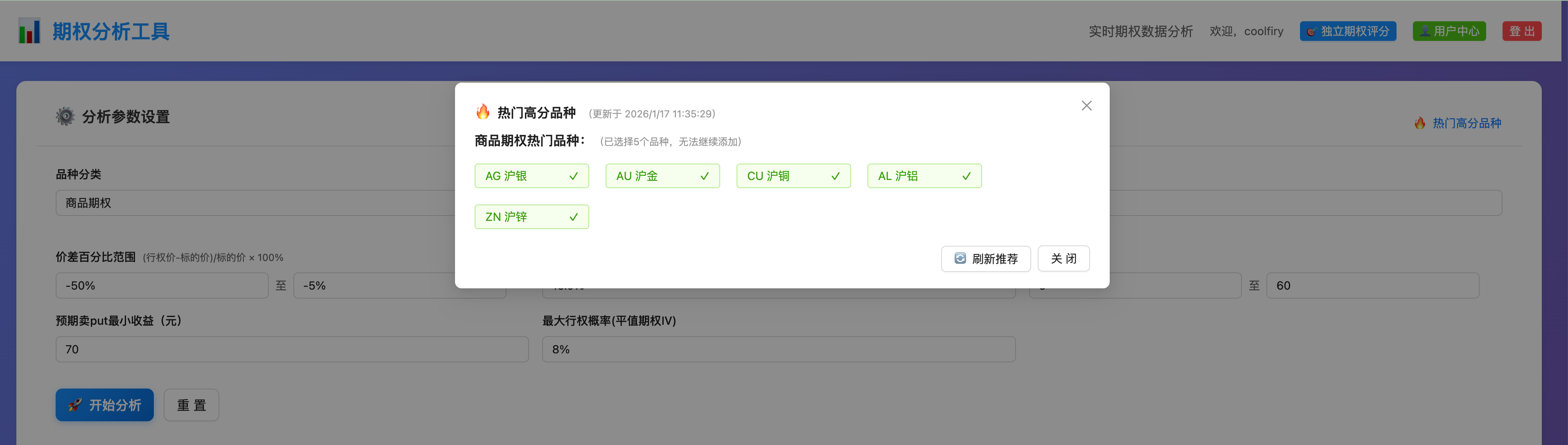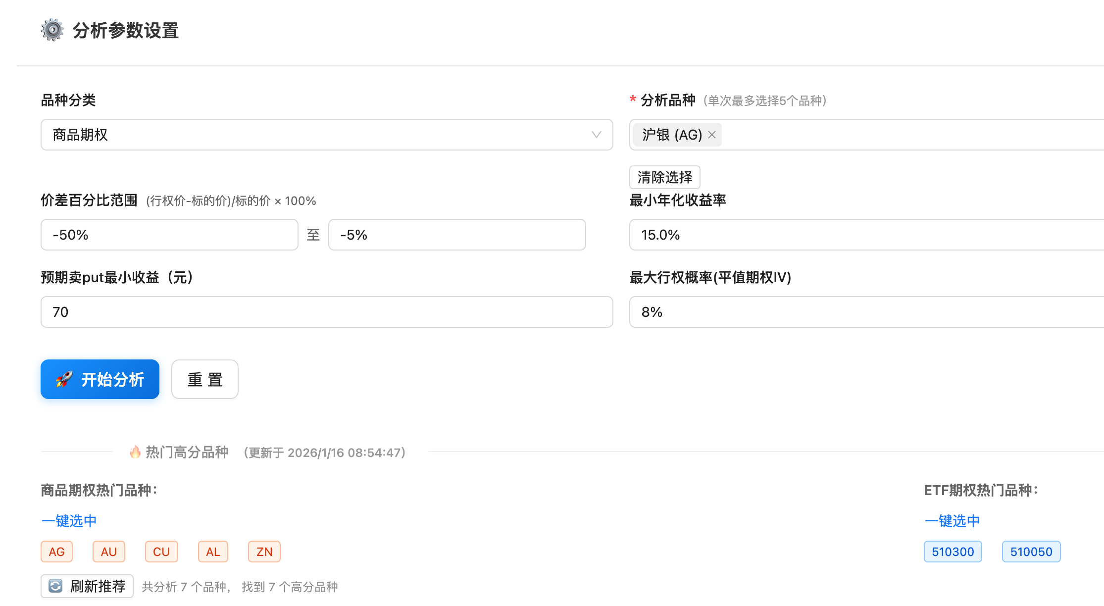不太好用,默认参数搜,结果为0不如直接按日把默认的品种结果列出来,需要实时的调参的再搜不迟这个功能正在开发,会讲当日比较容易搜索出品种的列出来。 结果是0那就证明当前品种的期权卖都不划算。