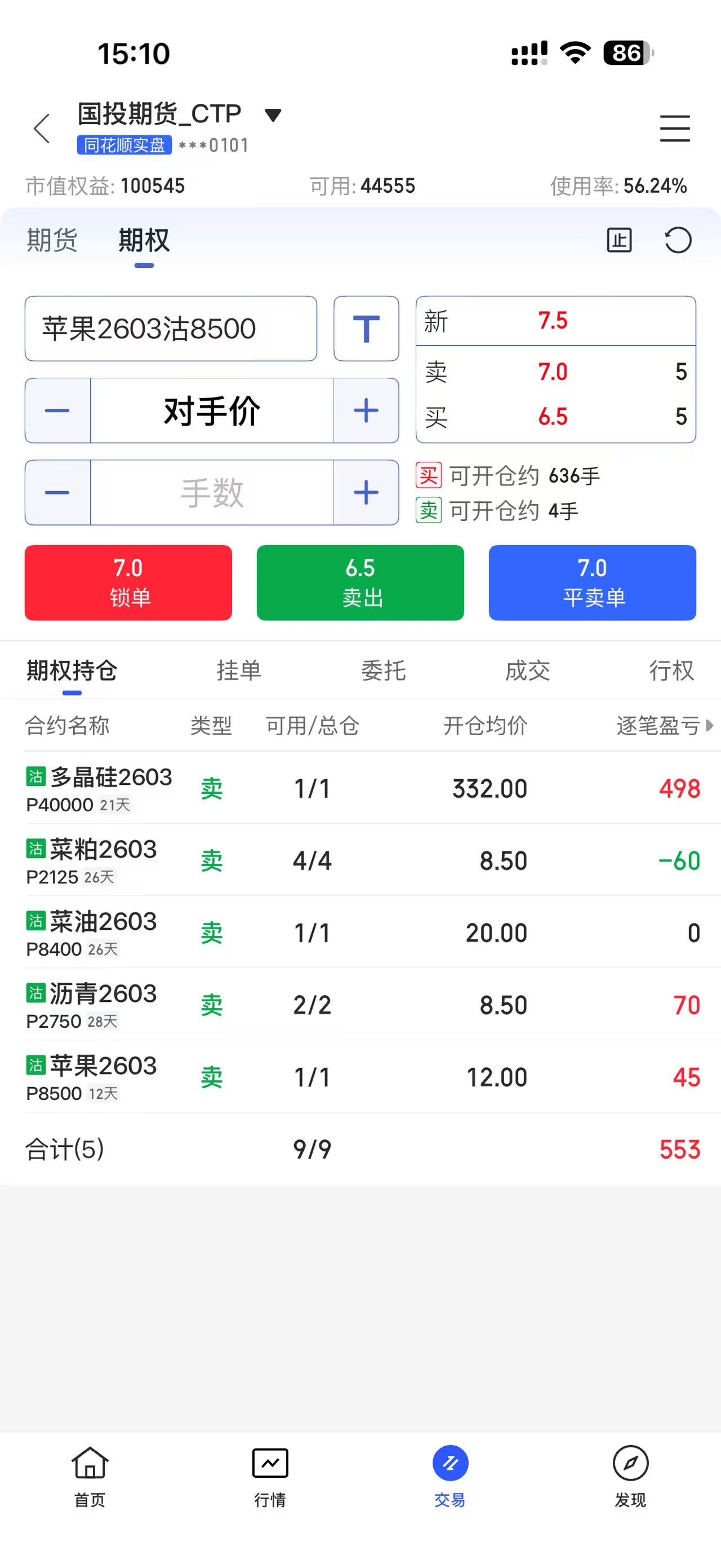 今天实盘:没有任何操作,盈利未知,是否连续10天盈利这个还真不好说,因为APP显示的利润因为剩下的时间价值太少了,所以是不准确的了。 实际上应该是赚钱的,因为我看了几个合约的情况今天还都是上涨的。 今天在研究期货所以没有来的及卖出期权,还有一个原因是今天好像很多品种都在涨,卖也不划算。 等明天卖一卖。