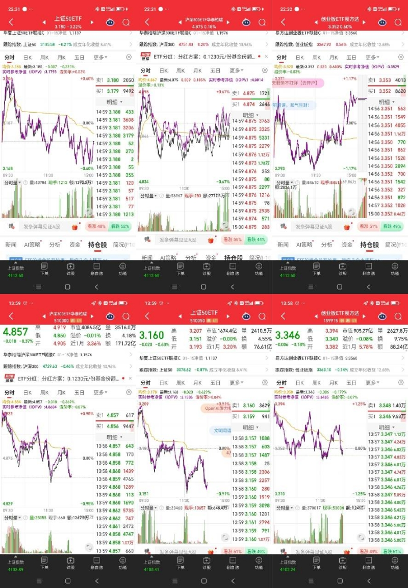 今天观察盘面,同样的中证1000,股指期货代表着市场资金的意愿,中证1000ETF代表着GJD的意愿。现在有冲突,GJD看到中证1000一涨,ETF就会放量砸盘,如果不放量,指数自己就上去了,再看IM股指期货,在ETF不放量的时候,IM总是比中证1000指数先一步上涨。国家队主要还是在300ETF和500ETF,今天多个品种继续放量。159919上午的量已经超过昨天一天了。