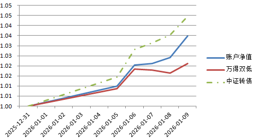 账户净值本周下跌-0.39%,2026年累计涨幅6.13%;万得可转债双低指数本周下跌-1.47%,2026年累计涨幅2.22%。