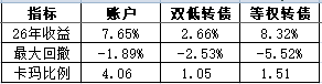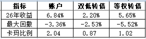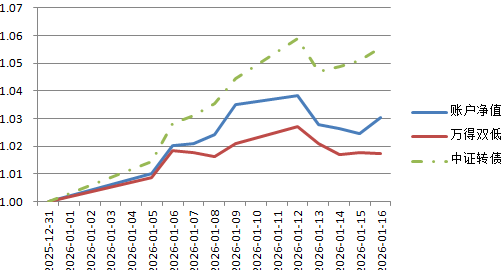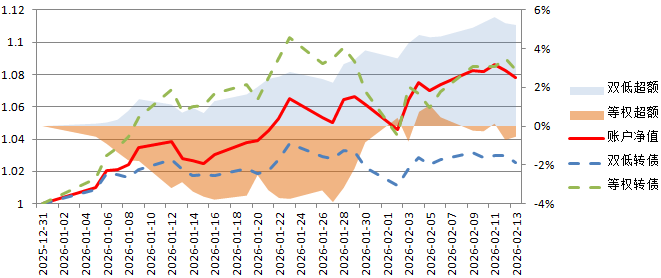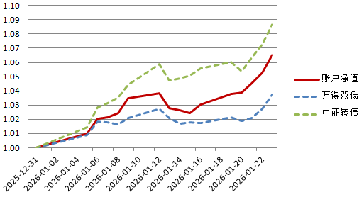 账户2026年累计涨幅6.54%,本周涨幅3.40%;万得可转债双低指数2026年累计涨幅3.75%,本周涨幅1.97%,年内累计超额2.79%。
