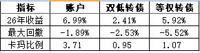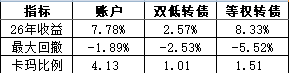 2026年,账户累计涨幅7.39%,显著跑赢双低转债指数(2.76%),并在本周反超等权转债指数(6.94%)。同时有效控制最大回撤,卡玛比例接近4倍。