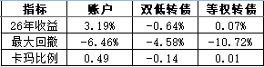 账户2026年累计涨幅6.54%,本周涨幅3.40%;万得可转债双低指数2026年累计涨幅3.75%,本周涨幅1.97%,年内累计超额2.79%。