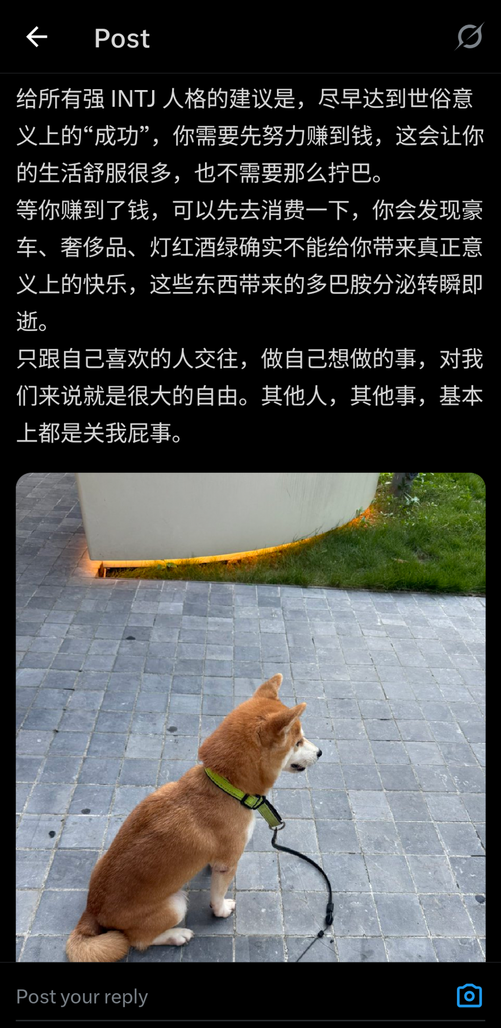 这东西一直会变的,刚毕业的时候是INTP,工作第一年是INTJ,现在是ISTP。心路历程对应的是:有理想有责任的佛系,有理想有责任的卷,纯躺佛。