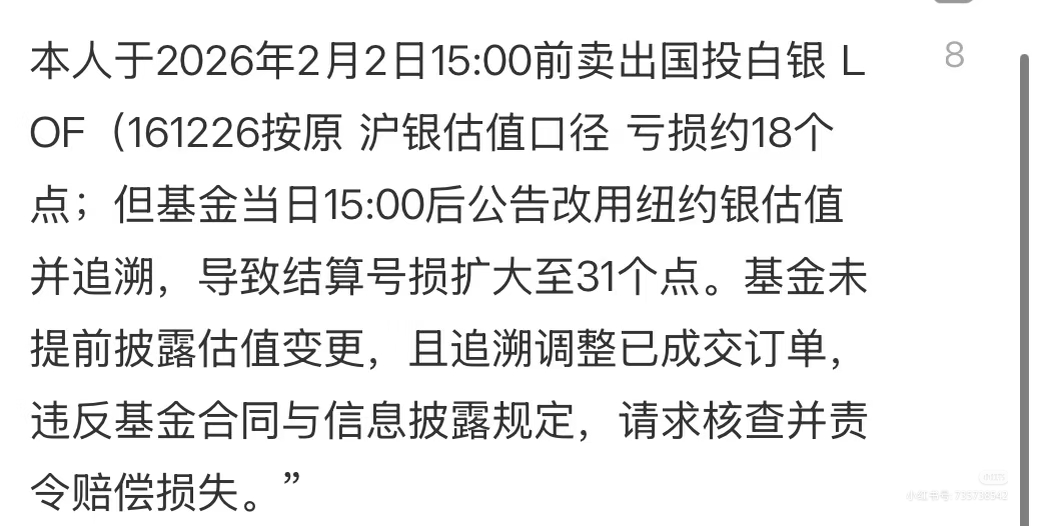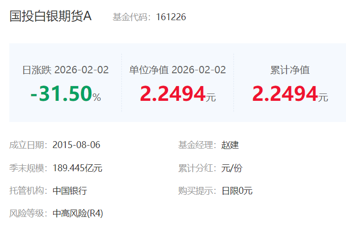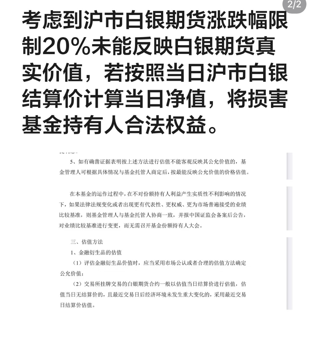 2月2日晚间,国投瑞银基金公告,近期,国际白银价格出现显著波动,鉴于当前市场的特殊性,自2026年2月2日起,我们对国投瑞银白银期货证券投资基金(LOF)持有的白银期货合约(AG2604、AG2605、AG2606、AG2608、AG2610、AG2612),参考估值日北京时间下午3点的白银期货国际主要市场价格相对前一交易日北京时间下午3点的波动幅度进行估值。