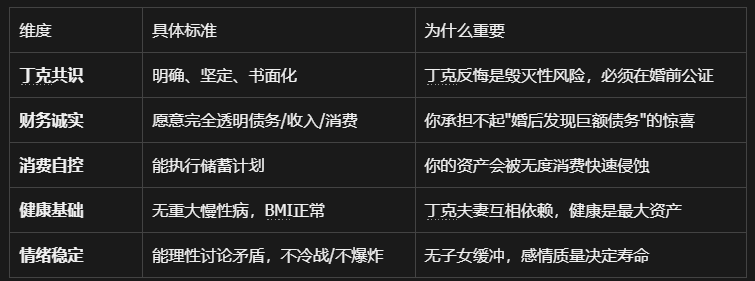 1. 财务观同频:认同“丁克需重点规划未来”,愿意共同制定储蓄、理财、保险配置计划,消费观相近,现金流适配,不刻意改变彼此,也不无度消费。