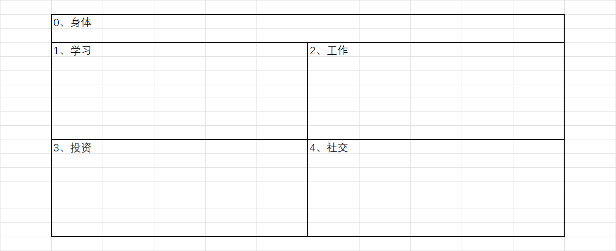 目前我会在笔记本上画出4个象限来,每个象限分别对应学习、工作、投资、社交,在每个象限下面写入要做的事情,按计划完成,如下图所示。