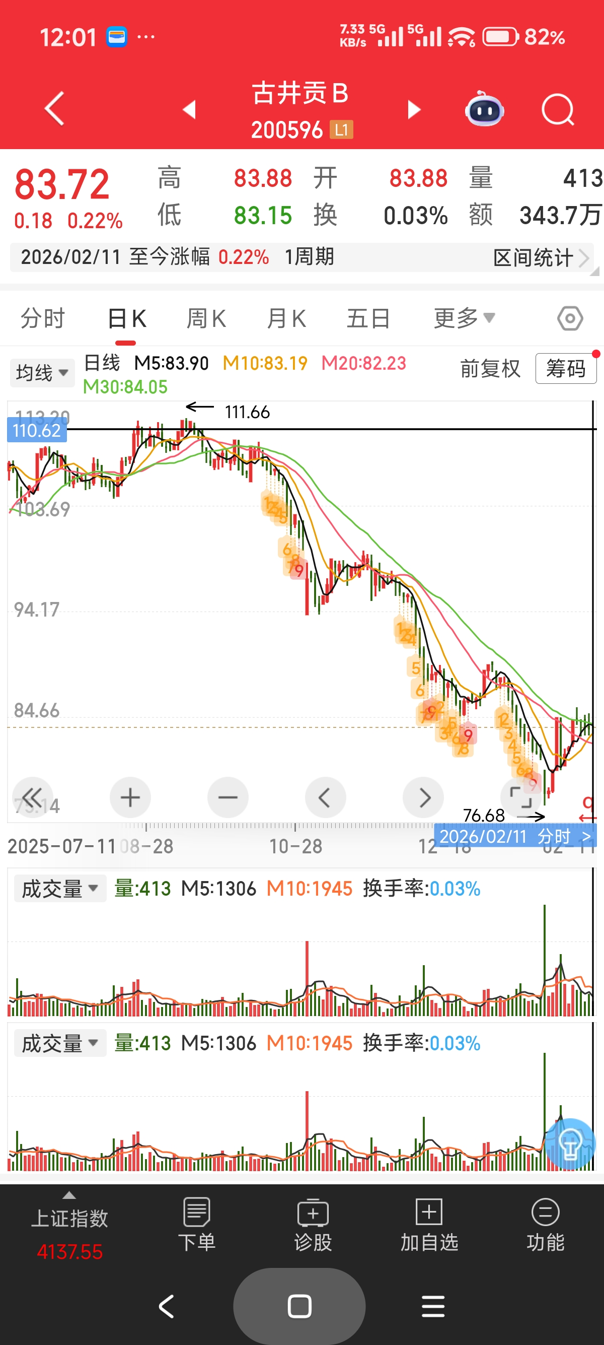 我的沪深B股一直是满仓的,要买,不得不从古井贡B那两个卖出,拿出钱来买。幸好!卖出的少亏了20%,买入的赚了60%。前前后后三次,买了400手。