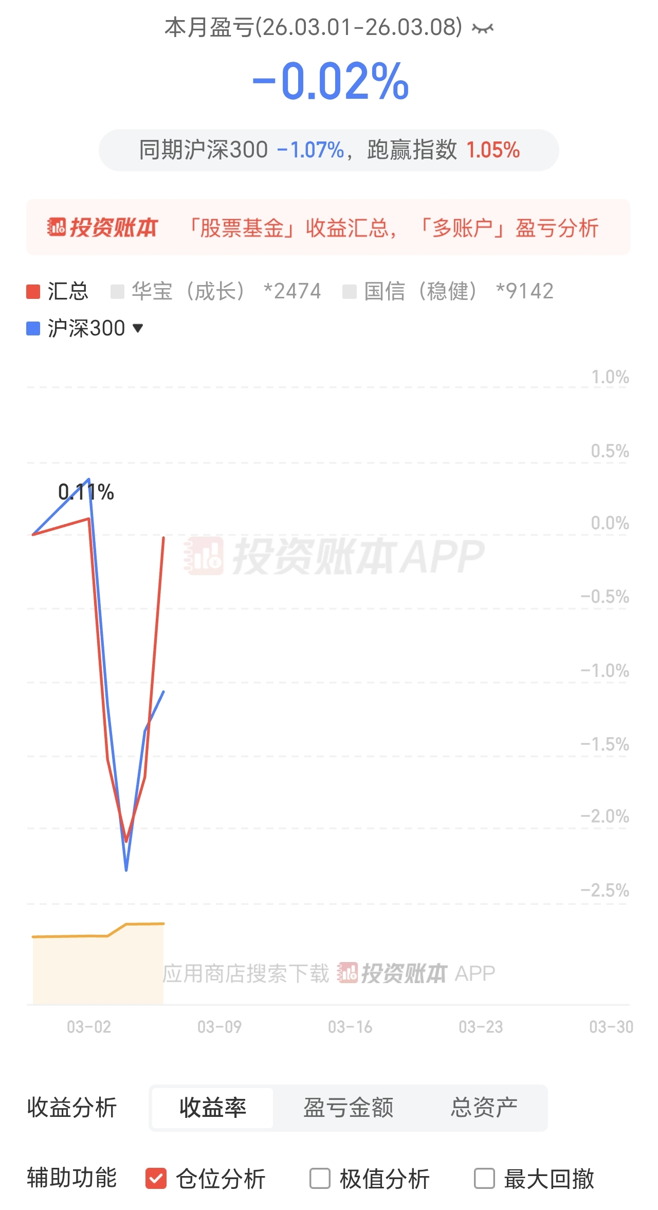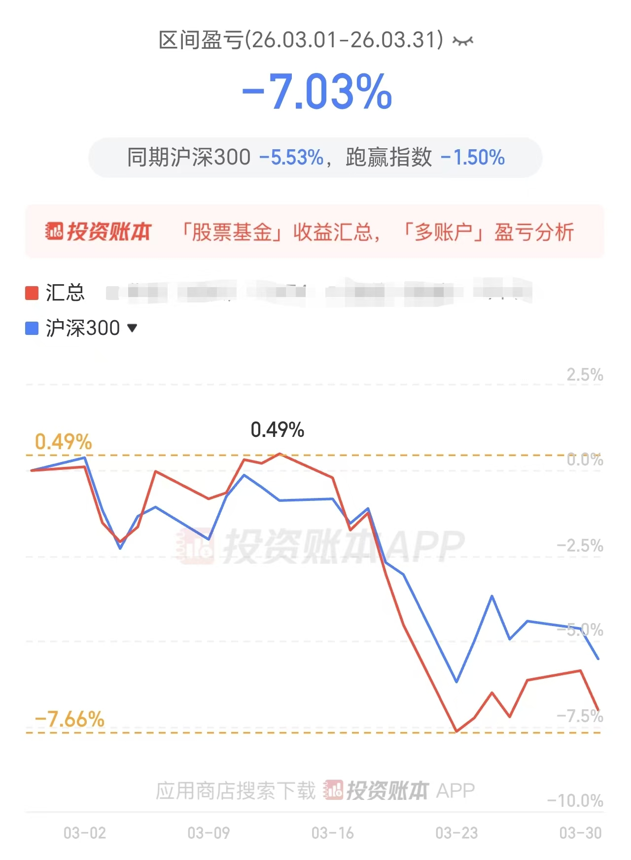 3月收益率-7.03%,仓位降到8成,除去中金三傻的套利仓位,权益不到4成。在美伊战争影响下,没有及时调整仓位和策略,最后两周大幅回撤,录的最大当月亏损。